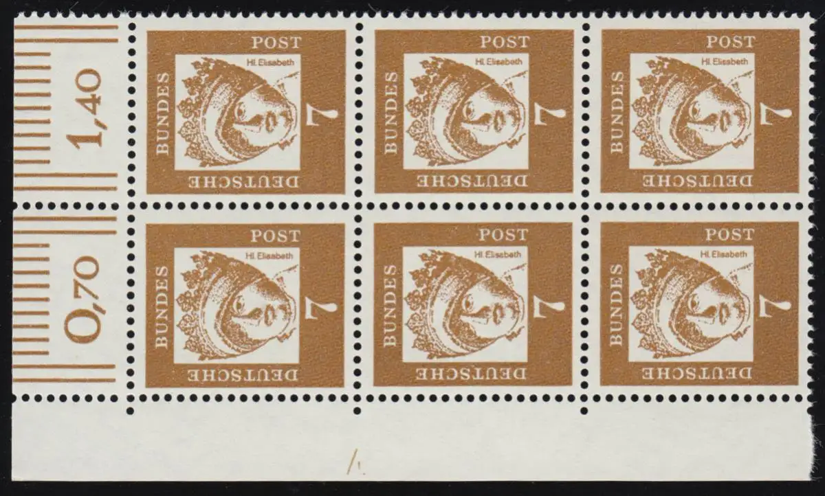348y DZ Hl. Elisabeth 7 Pf als Eck-6er o.l. mit Druckerzeichen 4 oben, **