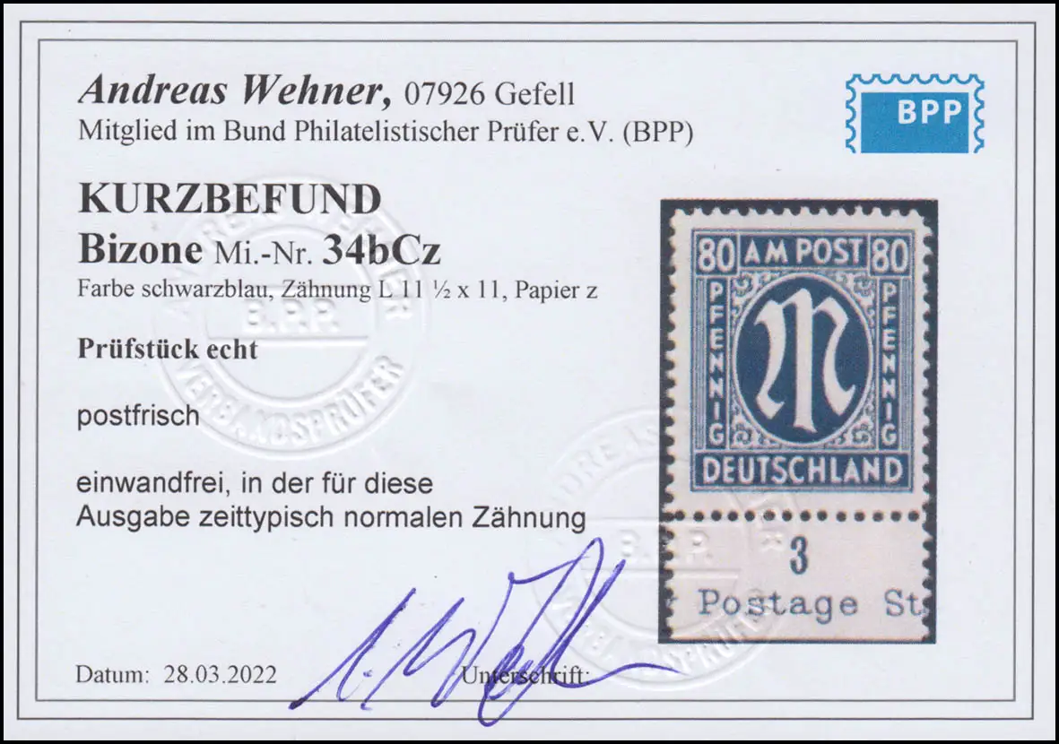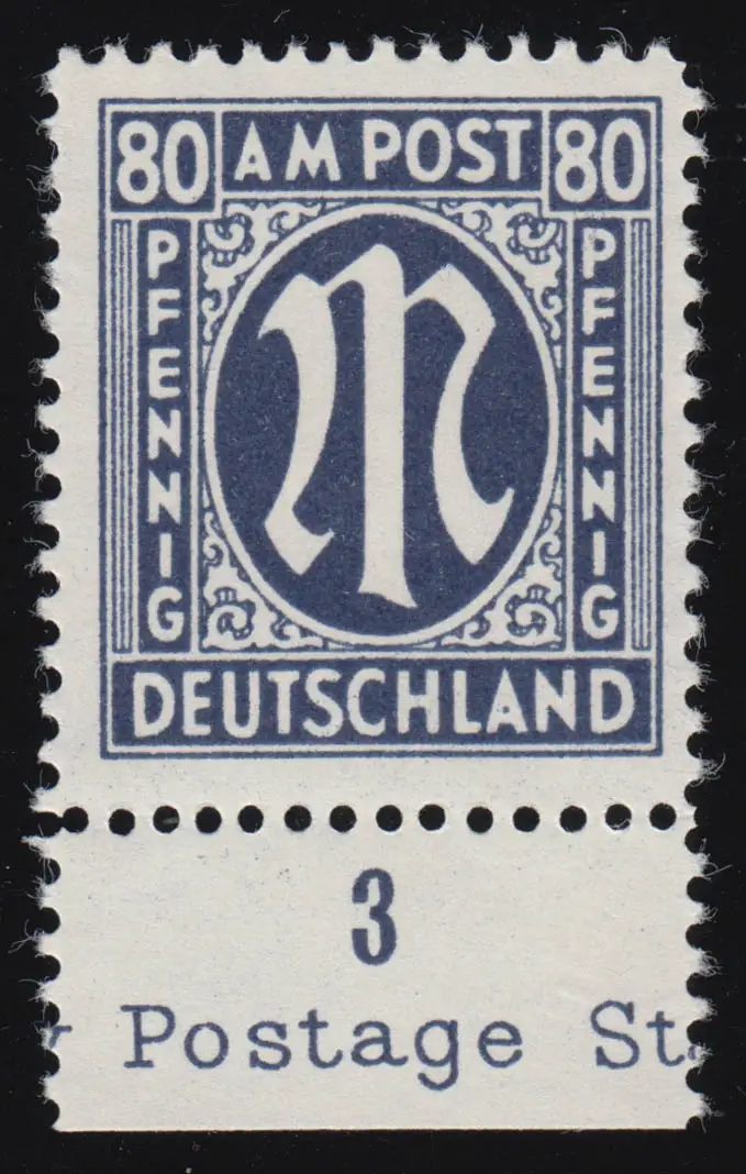 34b AM-Post 80 Pf Unterrand seltene Farbe schwarzblau, ** Befund Wehner BPP