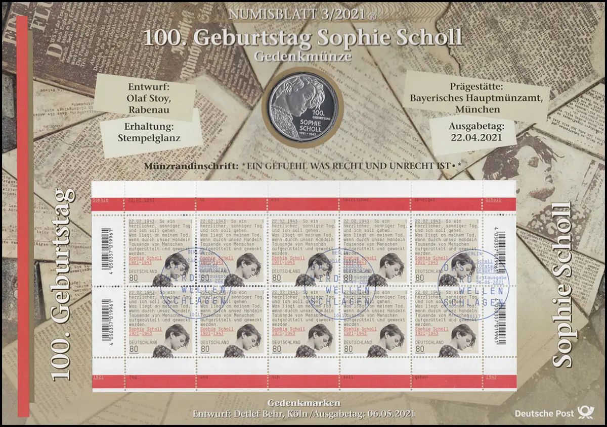 3606 100. Geburtstag von Sophie Scholl - Numisblatt 3/2021