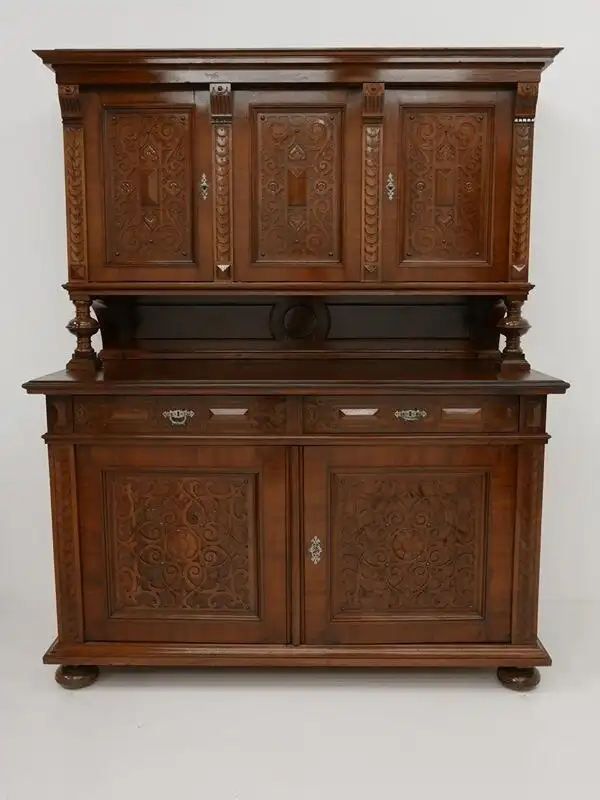 eine wunderschöne, komplett überarbeitete Historismuskredenz, mit herrlichen Schnitzereien und Drechselarbeiten an der Front, 5 Flügeltüren - innen jeweils ein Fachbrett vorhanden, 2 Schubladen, ORIGINAL Schlösser mit 3 Schlüssel - sperrig, schöne Beschläge, bietet jede Menge Stauraum, herrliches Gesamtbild. \n\nMaße: ca. 158 cm breit ca. 195 cm hoch ca. 70 cm tief \n\nArtikelnummer: 3618