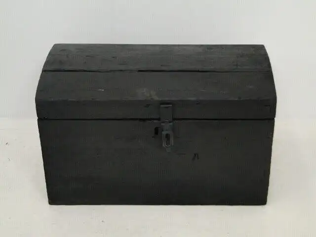 eine schöne Schatztruhe um 1900 neuer schwarzer, matter Anstrich, eine Arbe zum absperren, mit altersbedingten Gebrauchsspuren wie auf den Bildern ersichtlich ein Trocknungsriss im Deckel. \n\nMaße: ca. 67 cm breit ca. 40 cm hoch ca. 35 cm tief \n\nArtikelnummer: 3694
