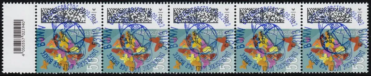 3714AI Schmetterlingsbrief 50 C. 200er, 5er-Streifen mit Codierfeld, ESSt Bonn