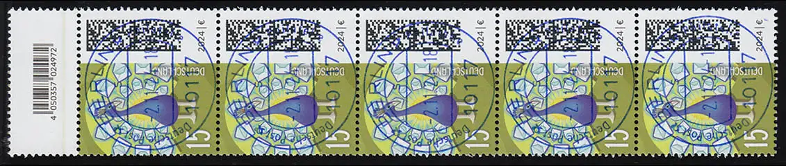3843 Briefpfau 15 C. 200er, 5er-Streifen mit Codierfeld, ET-O BERLIN