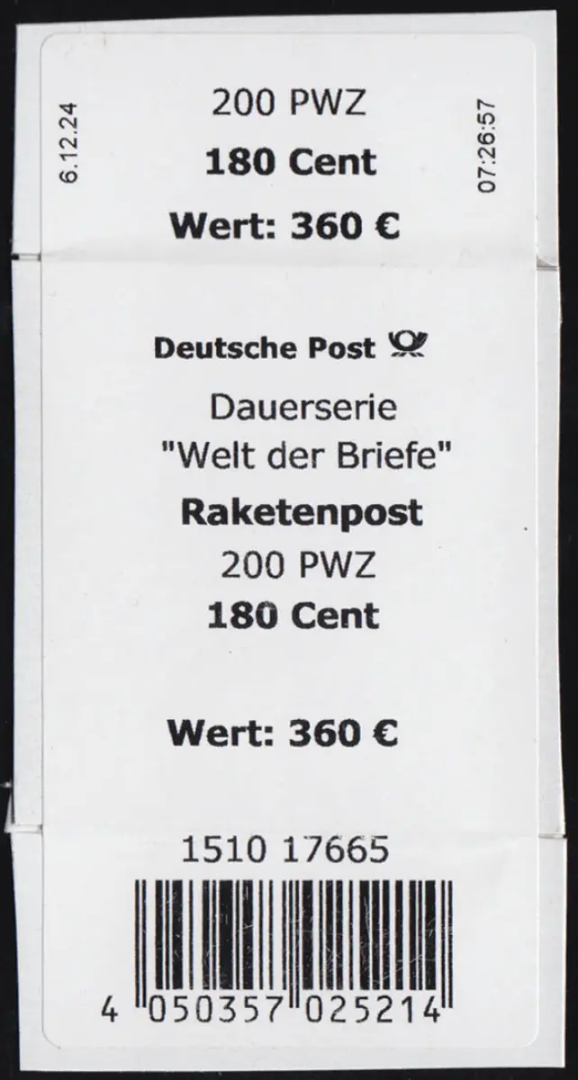 3870 Raketenpost 180 Cent - Banderole / Aufkleber BDB der 200er-Rolle