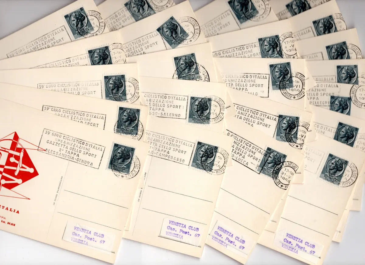 Umschlag - 39 Giro d'Italia - Giro komplett mit 23 Postkarten, die vom Venetia Club für die von Fausto Coppi gewonnene Radtour 1956 vorbereitet wurden - die Postkarten, alle unterschiedlich, geben den Namen des Etappensiegers an und werden mit entsprechender mechanischer Annullierung annulliert - Seltenes Set für Themensammlungen und Spezialisten Venetia Club Cod. 543/17