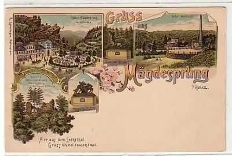 schöne farbige Lithographie, Totalansicht, Siegender Hirsch, besiegter Hirsch, Hotel Mägdesprung, Ruine Heinrichsburg, ungelaufen, gute Erhaltung siehe Bild,