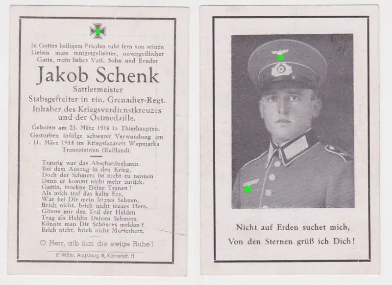 40191 Sterbebild WK2 Grenadier Regt. Kriegslazarett Wapnjarka Transnistrien 1944