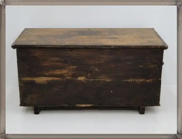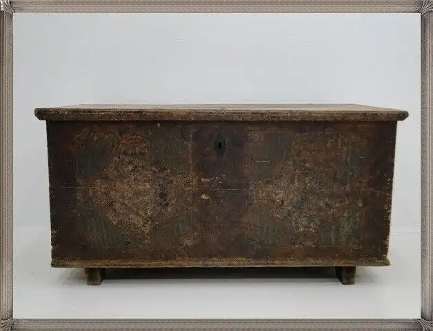 eine alte Schatzkiste - ca. 17. - 18. Jahrhundert, komplett in ORIGINAL-Zustand, innen ein zusätzliches kleines Fach mit Deckel, ORIGINAL Schloss - leider kein Schlüssel vorhanden, mit einigen altersbedingten Gebrauchsspuren - wie auf den Bildern ersichtlich ist, ich wollte den ORIGINAL - Zustand jedoch beibehalten. \n\nMaße: ca. 130,5 cm breit ca. 66 cm hoch ca. 69 cm tief Artikelnummer 4142