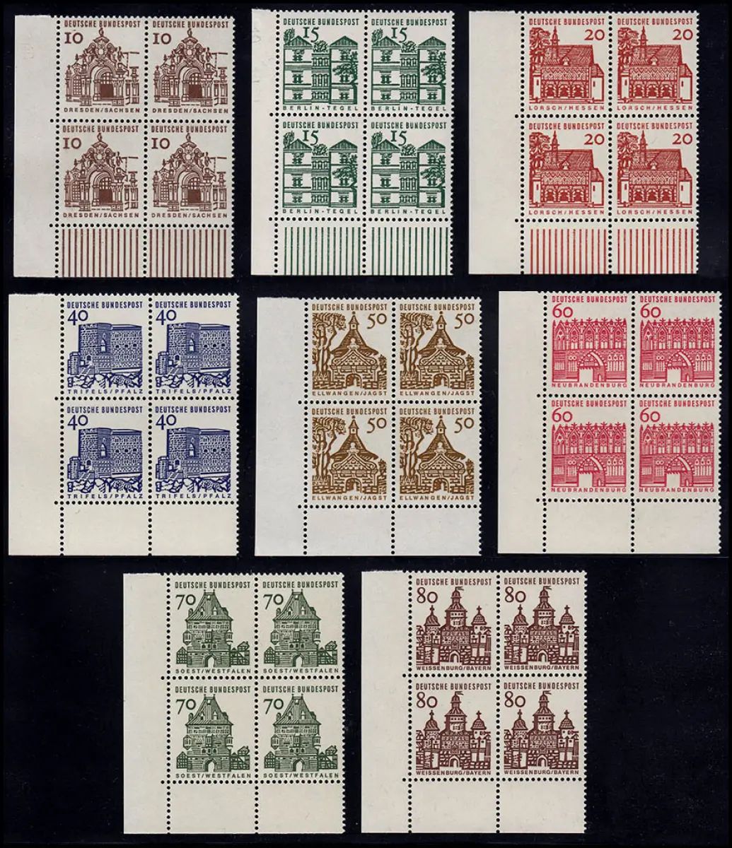 454-461 Bauten 8 Werte, Eckrand-Viererblock unten links, Satz postfrisch **
