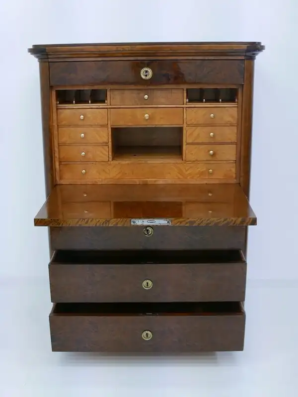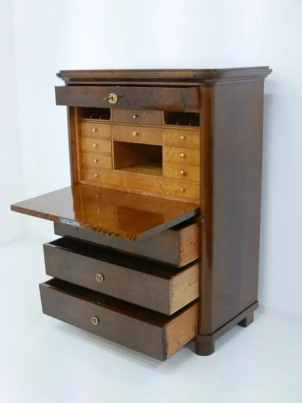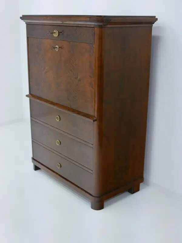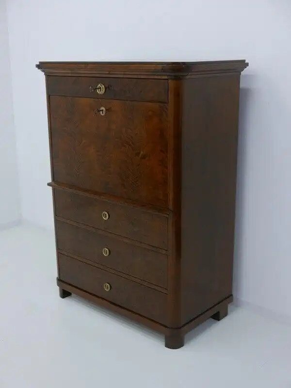 Ein herrlicher Sekretär, mit 4 Schubladen und einer ausklappbaren Ablagefläche, sehr schönes Wurzelholz-Furnierbild am gesamten Korpus, tolle Beschläge, ORIGINAL Schlösser - 2 Schlüssel vorhanden, einer der Schlüssel sperrt die Schubladen, einer den Sekretär, innen befinden sich 8 kleine Schubladen, eine große Schublade sowie 2 ausziehbare Ablagefächer mit Unterteilungen für div. Schreibutensilien und Briefe, auch innen sehr schön furniert, der Korpus wurde komplett überarbeitet und mehrfach Schellack poliert, wunderschönes Gesamtbild, hinstellen und daran erfreuen. \n\nMaße: ca. 102 cm breit ca. 138 cm hoch ca. 55 cm tief Artikelnummer 4605