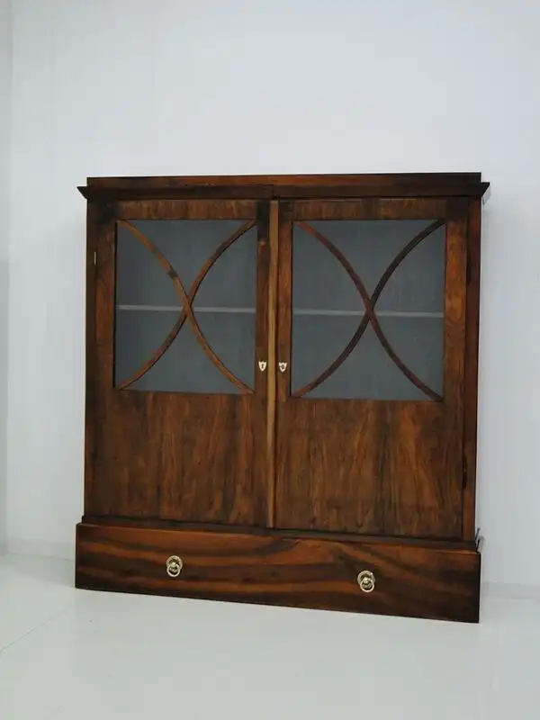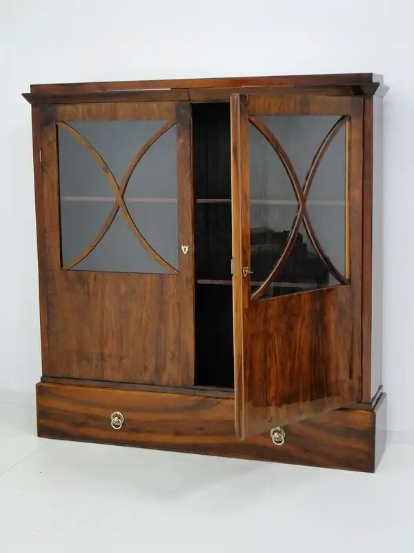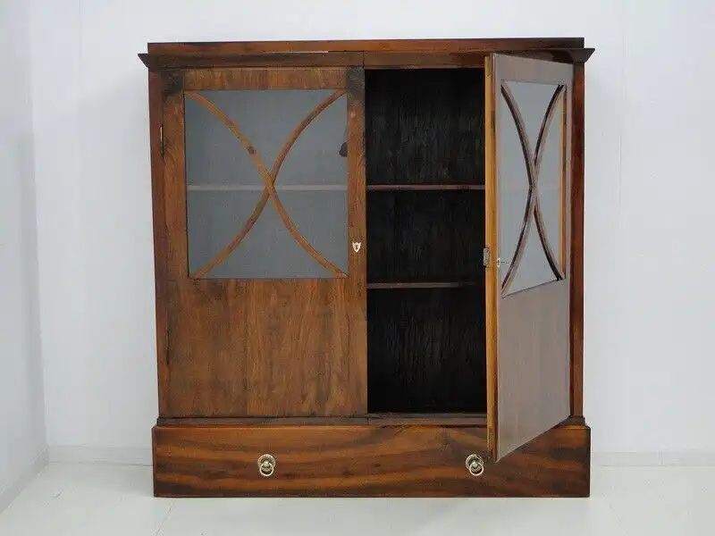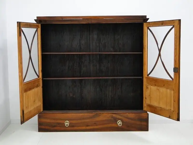Ein wunderschöner Biedermeier Reisekasten um 1810 - es handelt sich um ein traumhaftes Unikat, sehr schwer zu finden, mit herrlichem Furnierbild, eine Schublade, 2 Flügeltüren mit Glaseinsätzen, die Fächer sind mittels Verzahnung individuell höhenverstellbar komplett ORIGINAL, der Korpus wurde mehrfach Schellack handpoliert, der Kasten ist im Nu zerlegt und wieder aufgebaut, ein wahres Prachtstück und garantiert ein Blickfang. \n\nMaße: ca. 157 cm breit ca. 163 cm hoch ca. 34 cm tief \n\nArtikelnummer: 4688