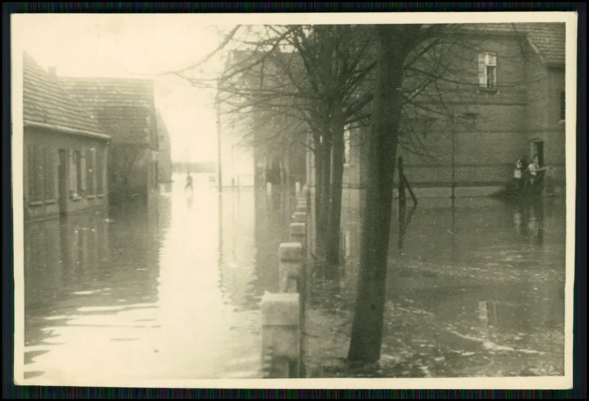 4x Foto - Hochwasser in einem Dorfgebiet, überflutete Häuser und Bäume Menschen 1930er