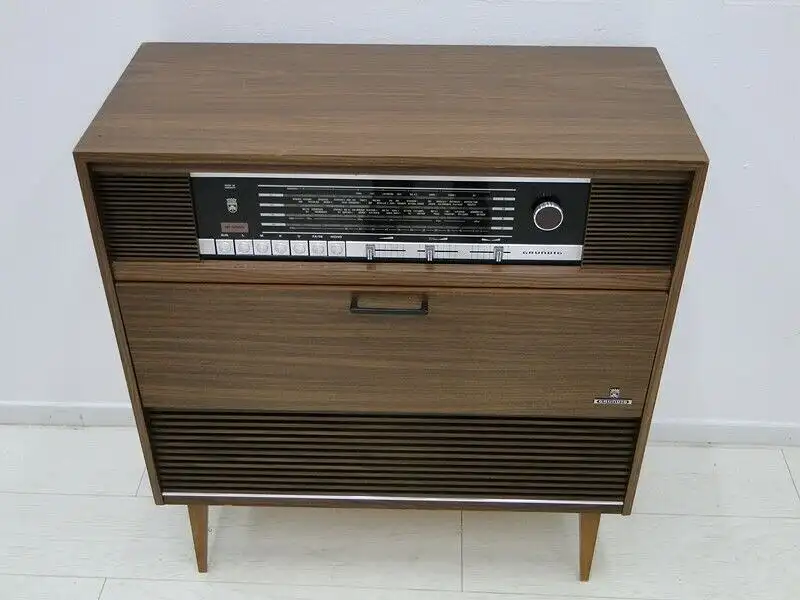 Ein schöner Grundig Phonoschrank mit integriertem Radio und Plattenspieler; Modell: Stereo-Konzertschrank Como 8; der Plattenspieler hat sich leider nicht in Betrieb nehmen lassen, beim Radio haben wir ein, zwei Sender empfangen, keine Gewähr auf die Elektronik da wir nicht wissen ob sie der geltenden Norm entspricht, guter Erhaltungszustand jedoch wie ersichtlich/beschrieben mit leichten altersbedingten Gebrauchsspuren, (auf der linken Seite befinden sich Furnierfehler) daher auch der günstige Preis. \n\nMaße: ca. 124 cm breit ca. 95 cm hoch ca. 74 cm tief \n\nArtikelnummer: 4906