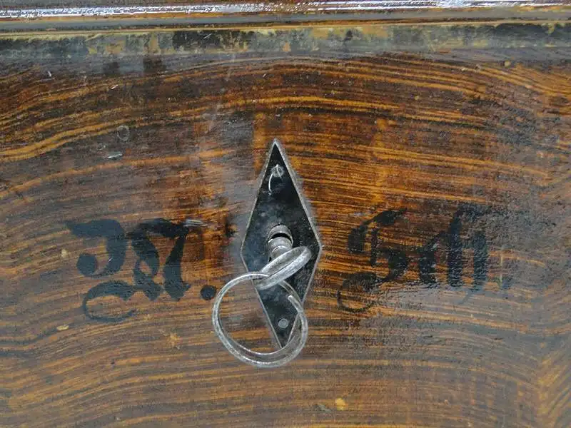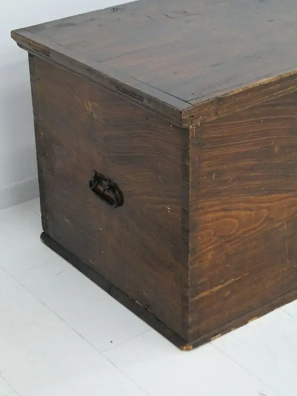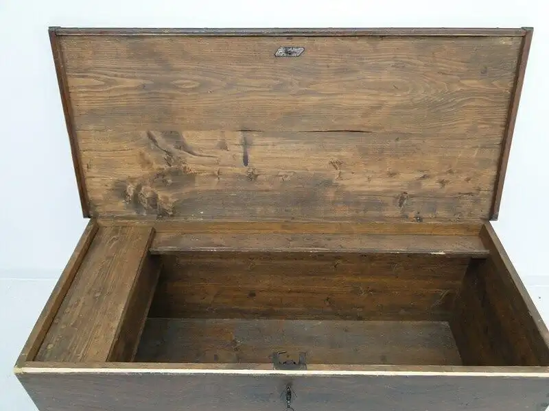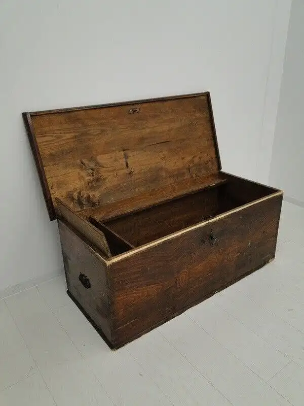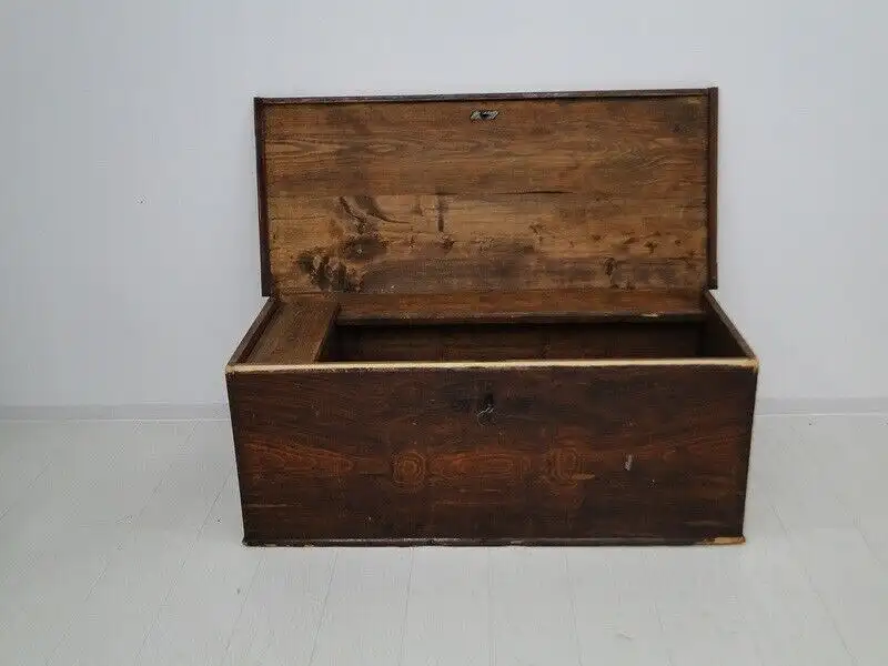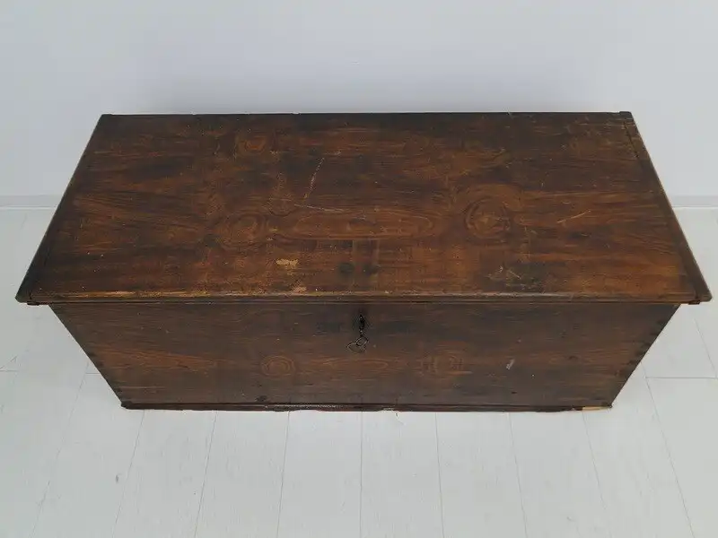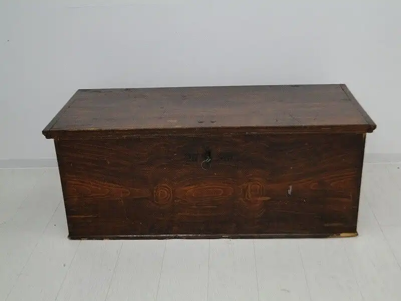 Eine schöne, alte Bauerntruhe mit Zangenschloss und Schlüssel, bietet jede Menge Stauraum, innen ein zusätzliches Fach vorhanden, seitlich zwei Griffe zum Tragen wie auf den Bildern ersichtlich mit altersbedingten Gebrauchsspuren, teilweise leicht bestossen, guter Erhaltungszustand (unrestauriert, wurde nicht überarbeitet und nicht poliert). \n\nMaße: ca. 134 cm breit ca. 53 cm hoch ca. 57 cm tief D \n\nArtikelnummer: 5197D