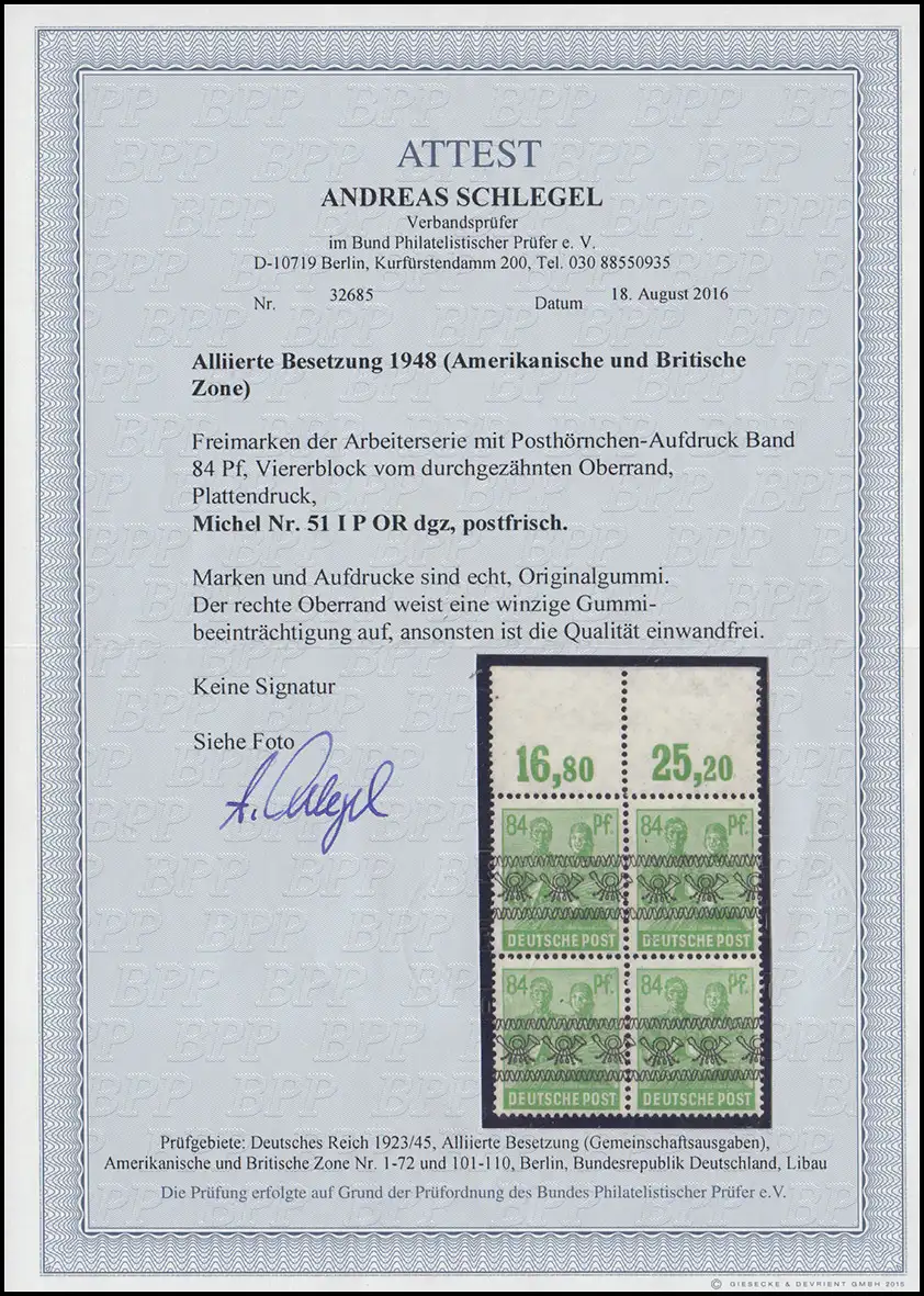 Viererblock Plattendruck mit durchgezähntem Oberrand, ungefaltet und nicht angetrennt, Fotoattest Schlegel BPP, postfrische Erhaltung. Im MICHEL 2024 mit 1200,- Euro bewertet.
