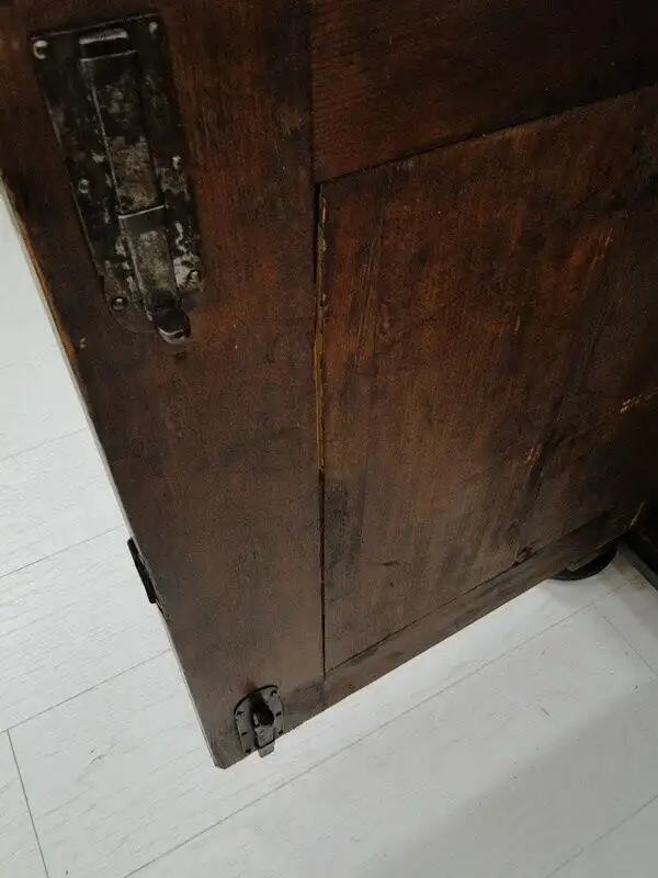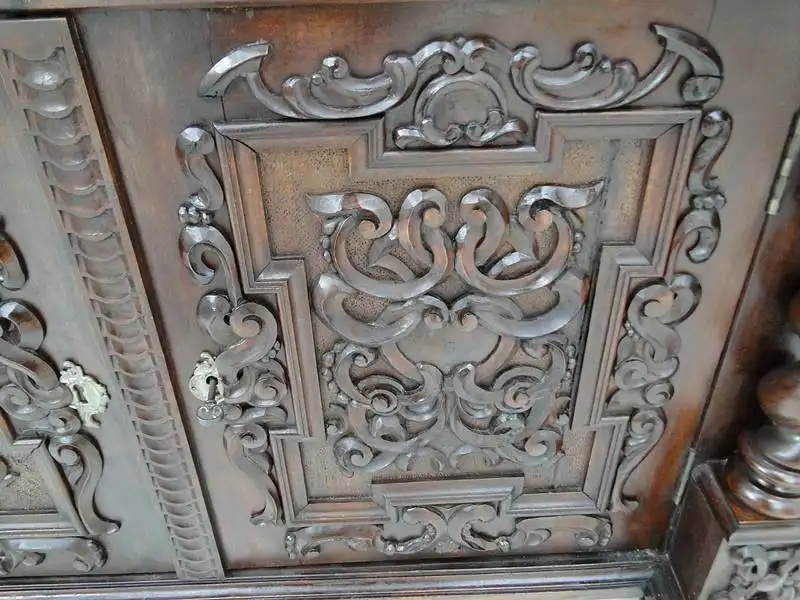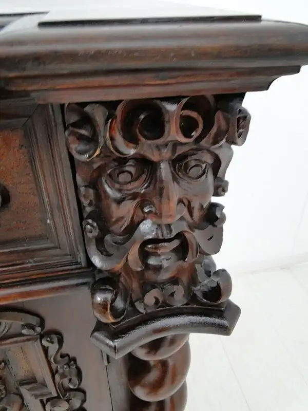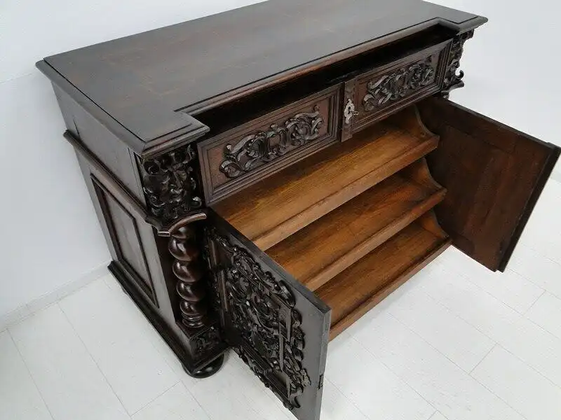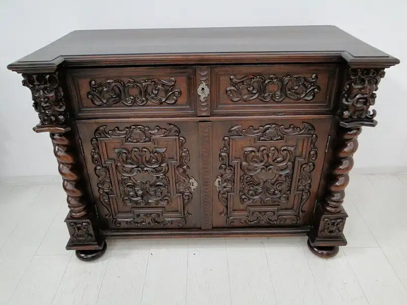 Eine traumhafte Barock Anrichte, mit wunderschönen, diversen Schnitzereien am gesamten Korpus, tolle Fratzen, schön gedrechselte Säulen seitlich an den beiden Flügeltüren, Schloss mit Schlüssel, 2 Schubladen, schöner Erhaltungszustand, wie auf den Bildern ersichtlich hat die Anrichte leichte altersbedingten Trocknungsrisse und Gebrauchsspuren, guter Erhaltungszustand, (unrestauriert, nicht Schellack poliert, nicht überarbeitet, auf Anfrage) \n\nMaße: ca. 132 cm breit ca. 97 cm hoch ca. 63 cm tief \n\nArtikelnummer: 5234 Artikelstandort: KS-H