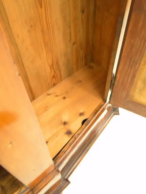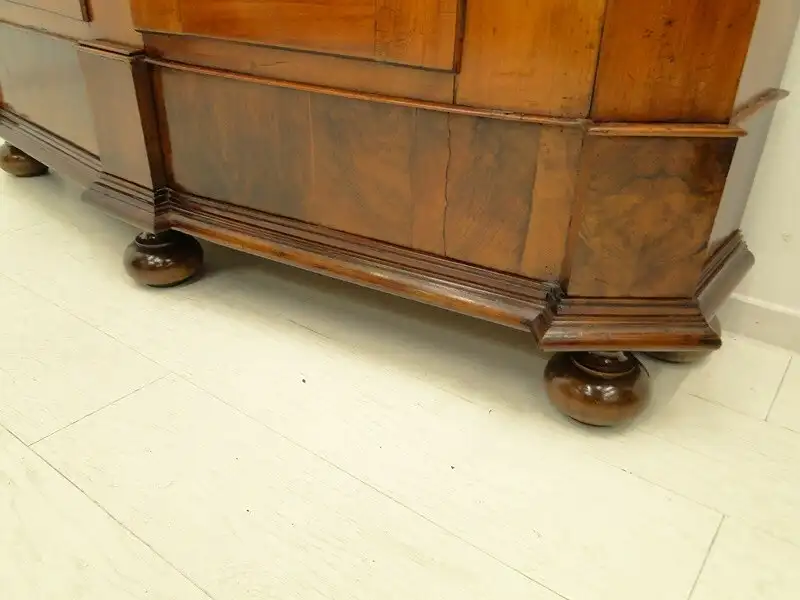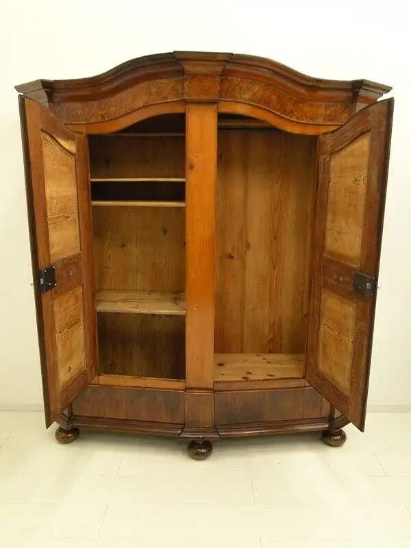 Ein herrlicher ORIGINAL Barockkasten ein sogenannter Reisekasten, daher auch die außergewöhnliche Tiefe - da diese Kästen früher zerlegt wurden und mit der Kutsche transportiert worden sind, ließ der Kasten sich so leichter verstauen, tolles Furnierbild mit schönen Intarsien, zwei Flügeltüren - innen rechts zum Hängen mittels Kleiderstange, links zum Legen mittels Fächer, im Bereich rechts unten befindet sich ein Geheimfach, der Außenkorpus ist komplett im ORIGINAL Zustand, im Laufe der Zeit wurden jedoch die Holzverbindungen teilweise durch Metall ergänzt und ersetzt, wie auf den Bildern ersichtlich hat der Kasten leichte altersbedingte Gebrauchsspuren ua. rechts unten ein Trocknungsriss, diese gehören jedoch bei solchen Möbel einfach dazu und verleihen Ihnen Ihren außergewöhnlichen Charme, der Kasten wurde komplett überarbeitet und aufgefrischt. \n\nMaße: ca. 174 cm breit ca. 188 cm hoch ca. 50 cm tief \n\nArtikelnummer: 5334D