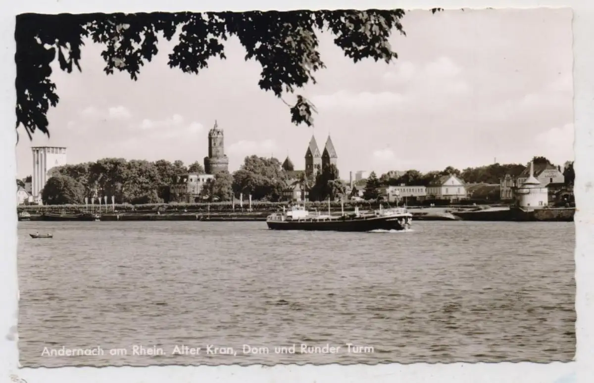 5470 ANDERNACH, Alter Kran, Dom und Runder Turm, Rhein - Frachtschiff
