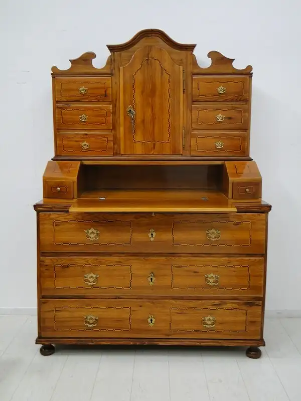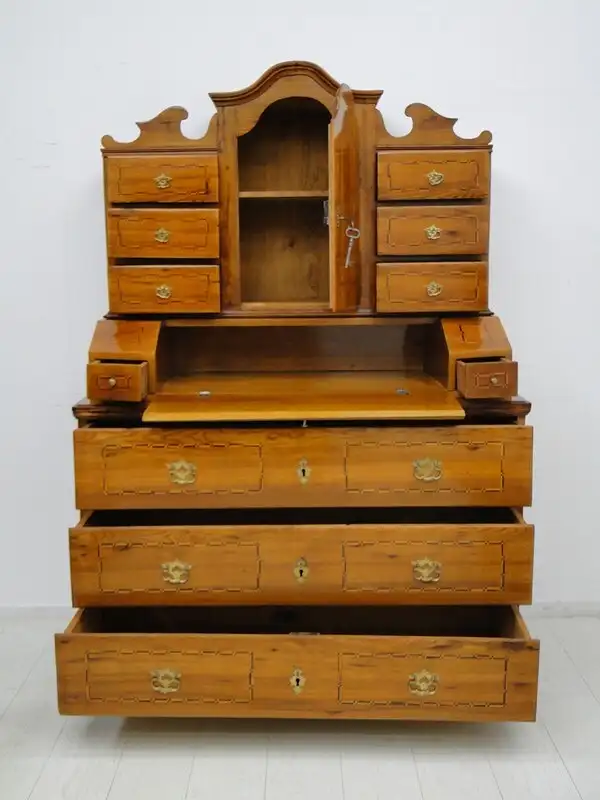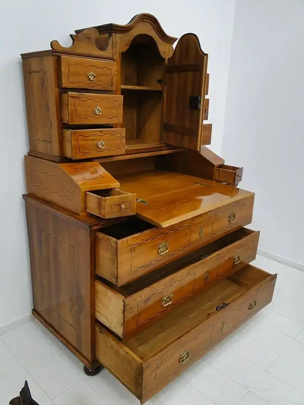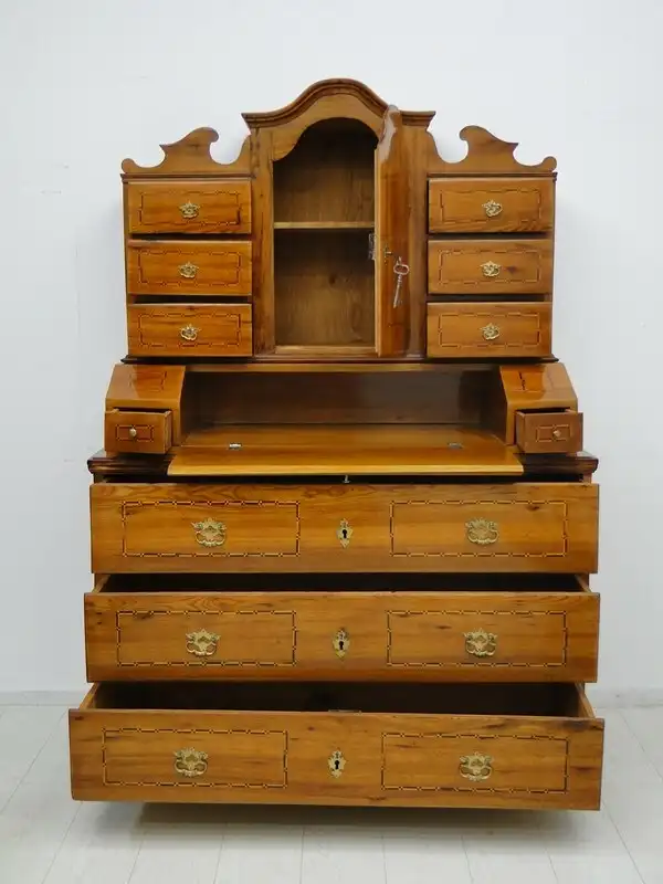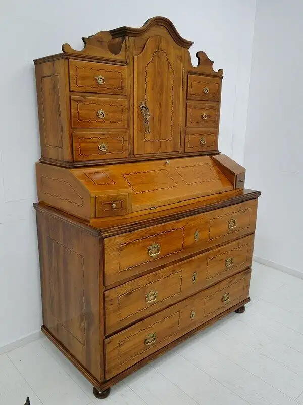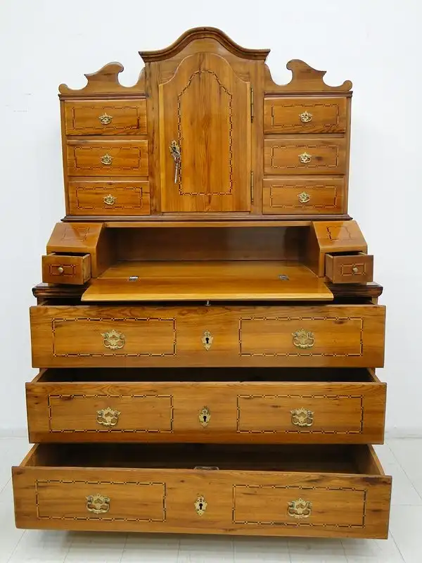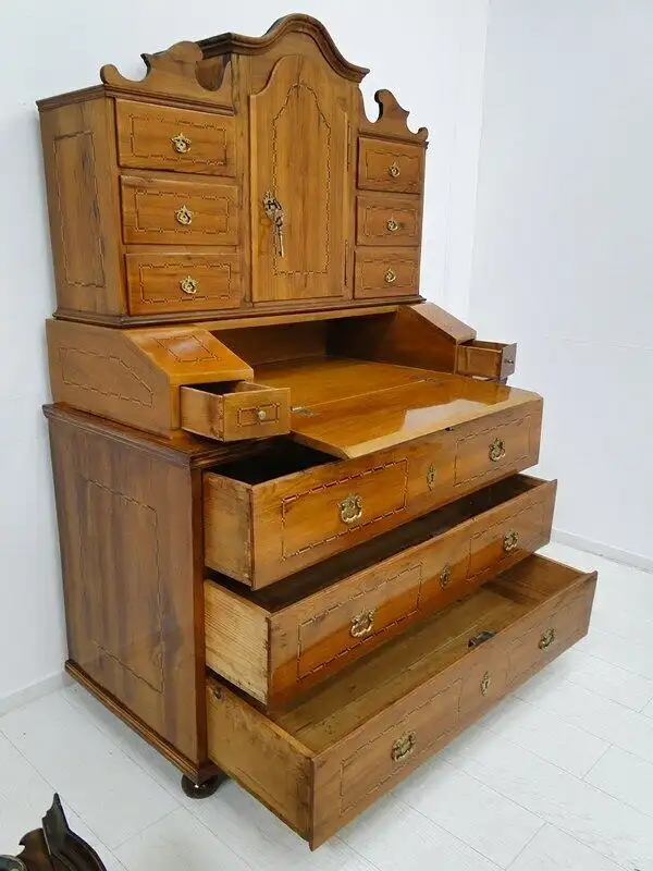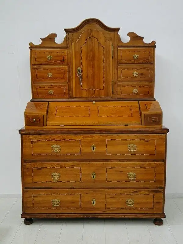 Ein traumhafter Barock Tabernakel, mit 3 durchgehenden Laden im unteren Bereich, einer Flügeltüre, einer ausklappbaren Schreibfläche und 8 Schubladen im oberen Bereich, herrliche Beschläge, ORIGINAL Schlösser, 2 Schlüssel vorhanden, Verriegelung der Laden oben, wunderschönes Furnierbild mit vielen Intarsien (Einlegearbeiten) aus diversen Edelhölzern, aufgefrischter Gesamtzustand. \n\nMaße: ca. 131 cm breit ca. 189 cm hoch ca. 65 cm tief \n\nArtikelnummer: 5572 H