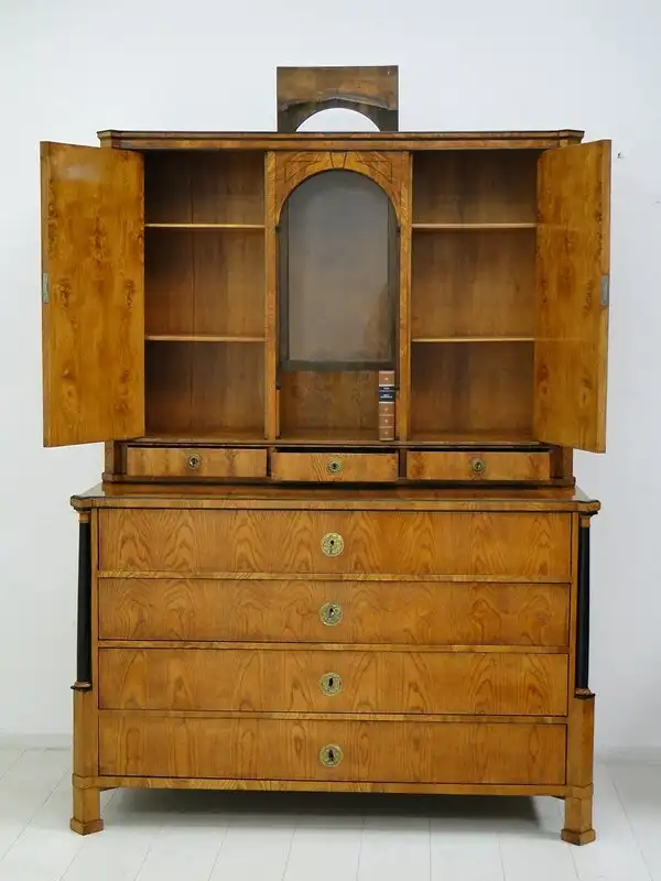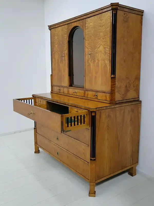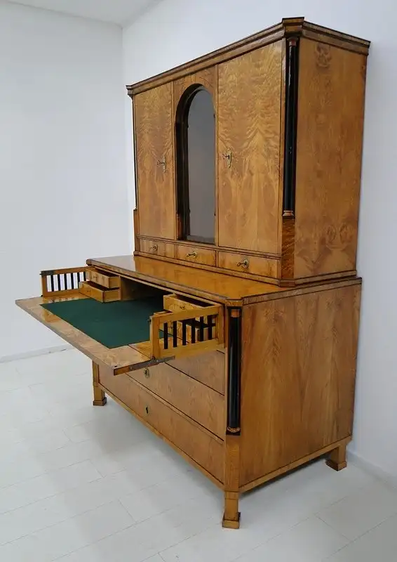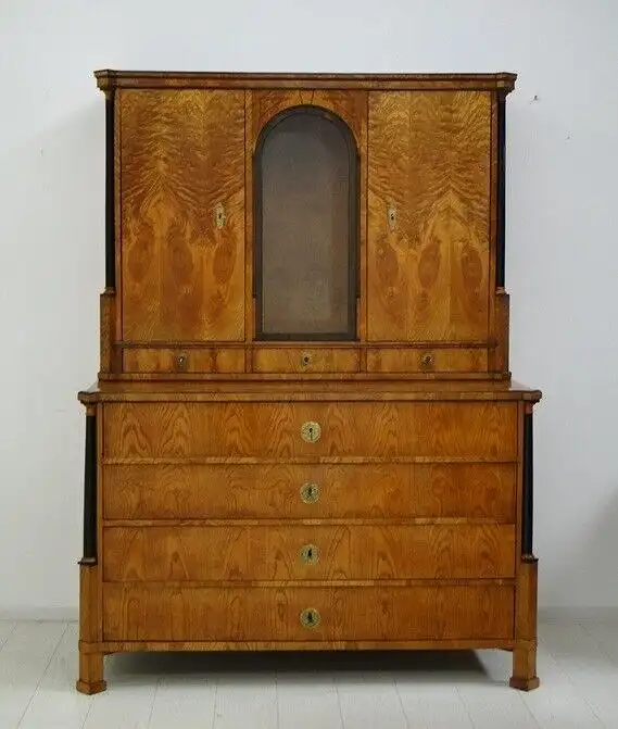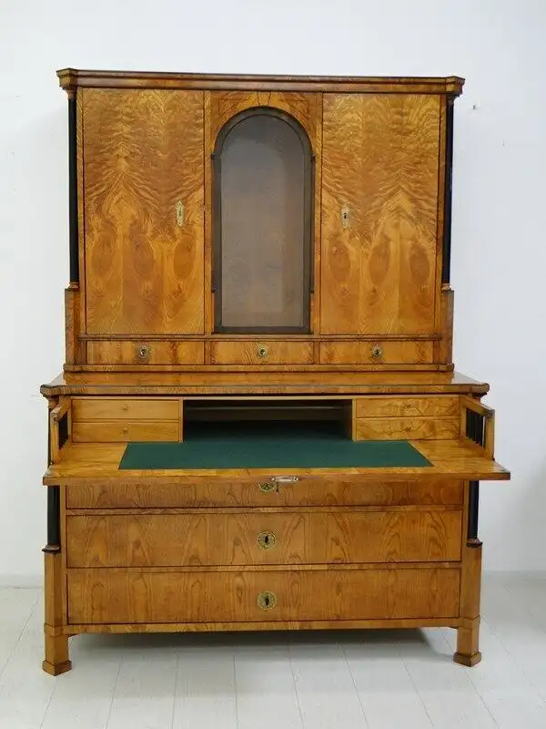 Eine fantastische Schreibkommode mit Aufsatz, wunderschönes Furnierbild am gesamten Korpus, auch innen sehr schön furniert, Esche, wie auf den Detailfotos ersichtlich wurden im Laufe der Zeit bereits einige Furnierteile ergänzt, stört das Gesamtbild jedoch überhaupt nicht, Schreibkommode mit 4 Schubladen, die oberste Schublade ist mit schönem, neuen, grünen Filz auf der Schreibfläche bespannt, 4 kleine Schubladen im Inneren, sowie ein kleines Fach, der Aufsatz hat 3 kleine Schubladen, 2 Flügeltüren und eine Schiebetüre mit Glaseinsatz, links und rechts jeweils 2 Fachbretter vorhanden, diese sind mittels Verzahnung individuell höhenverstellbar, ORIGINAL Schlösser mit 7 Schlüssel, schöne, schwarze Säulenelemente seitlich, wunderschöner, aufgearbeiteter und aufpolierter Gesamtzustand mit minimalen, altersbedingten Gebrauchsspuren. \n\nMaße: ca. 147 cm breit ca. 200 cm hoch ca. 80 cm tief \n\nArtikelnummer: 5575 H