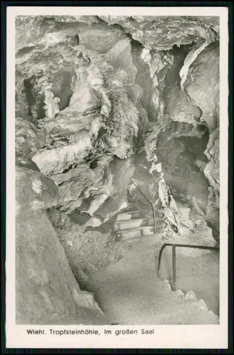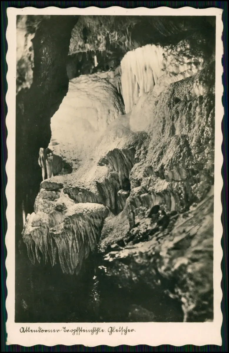 5 x AK Postkarte mit beeindruckenden Innenaufnahmen der Atta-Höhle in Attendorn, einer der größten und bekanntesten Tropfsteinhöhlen Deutschlands. Die Aufnahmen stammen aus den 1950er Jahren und zeigen verschiedene Höhlenabschnitte mit spektakulären Stalaktiten und Stalagmiten.