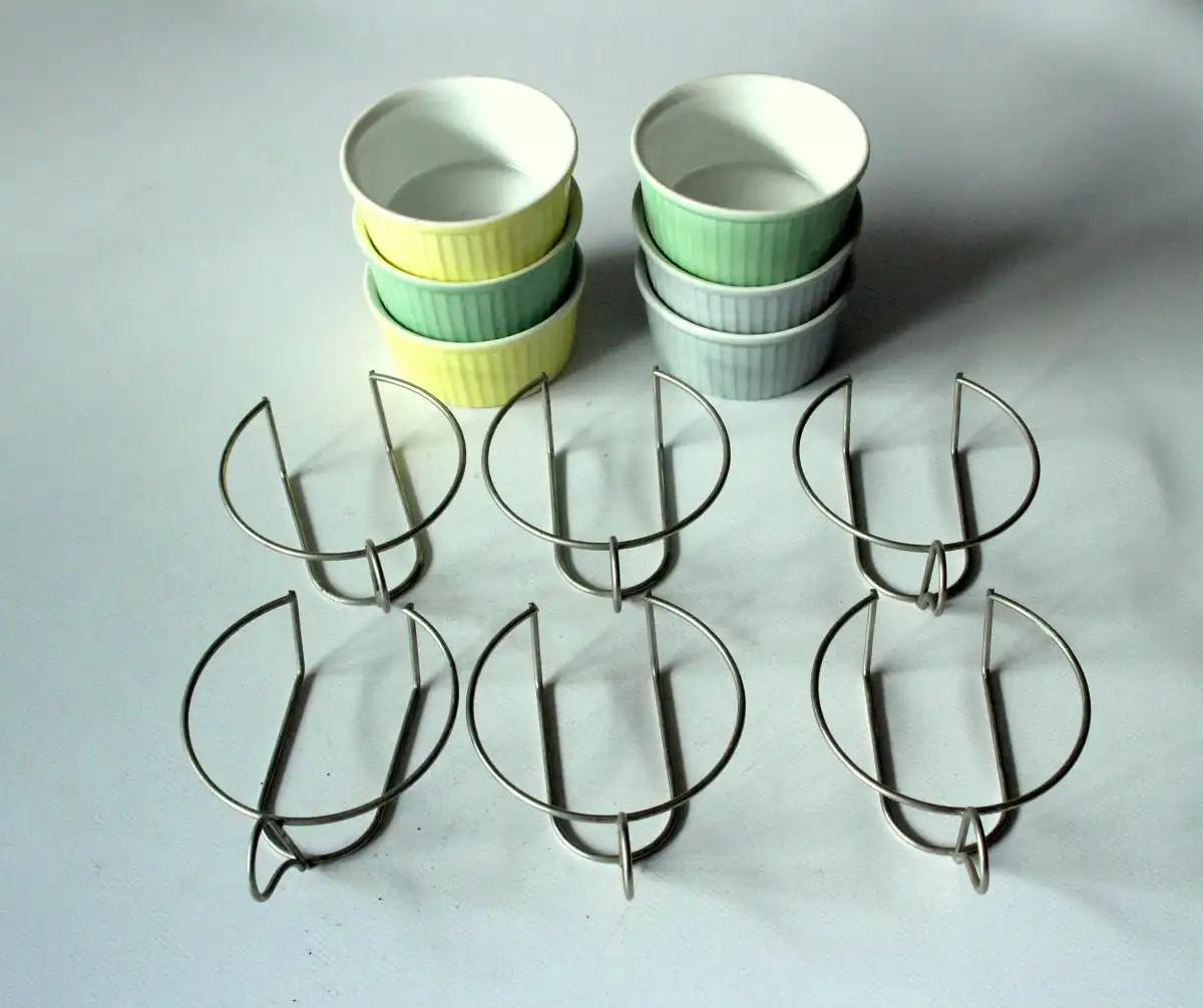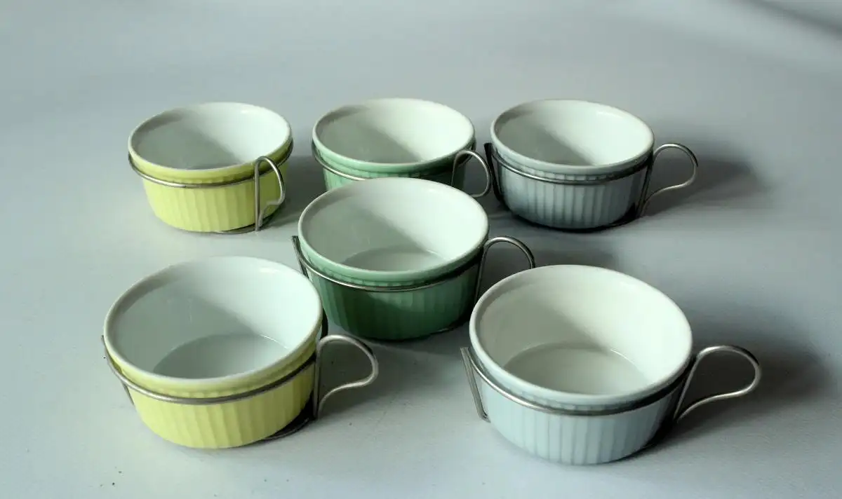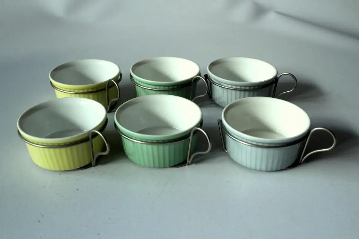 6 Rosenthal Souffle Formen farbig Keramik mit Metallhalter - Auflaufformen - Mini Backformen - Vintage