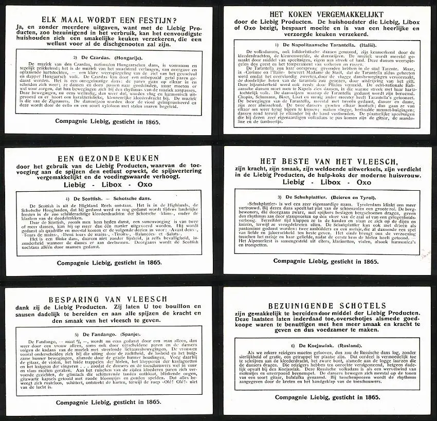 6 Sammelbilder Liebig, Serie Nr.: 1333, Volksdansen, Koejawiak, Fandango, Schuhplattler, Scottish, Tarantella, Czardas