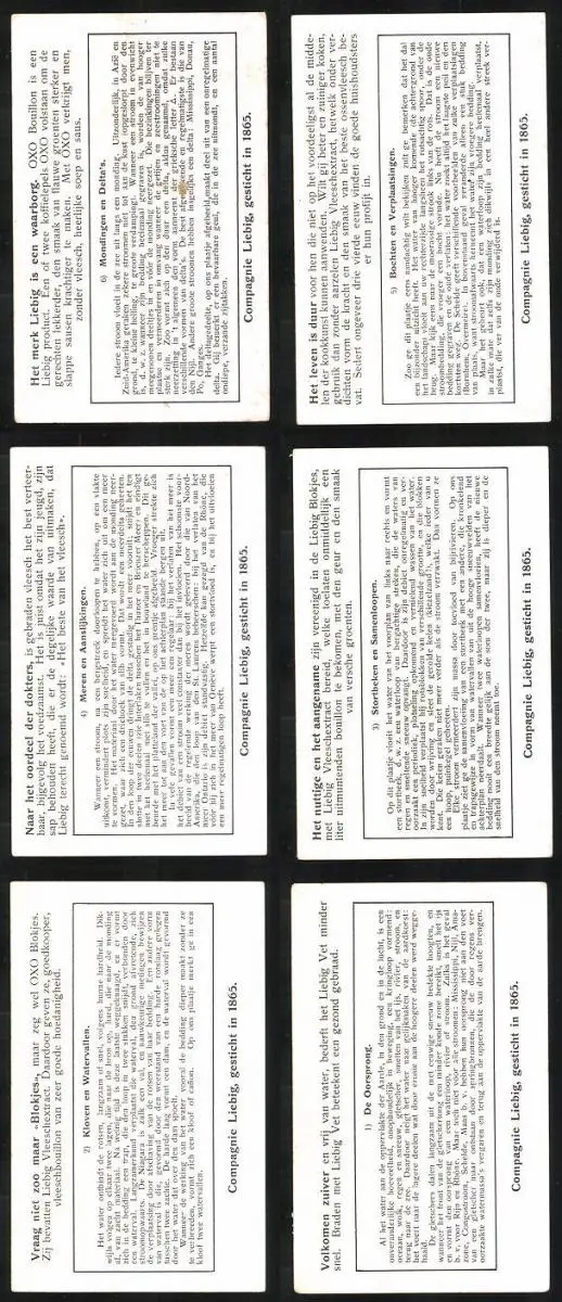 6 Sammelbilder Liebig, Serie Nr. 1353: De stroom, De Oorsprong, Kloven en Watervallen, Stortbeken en Samenloopen