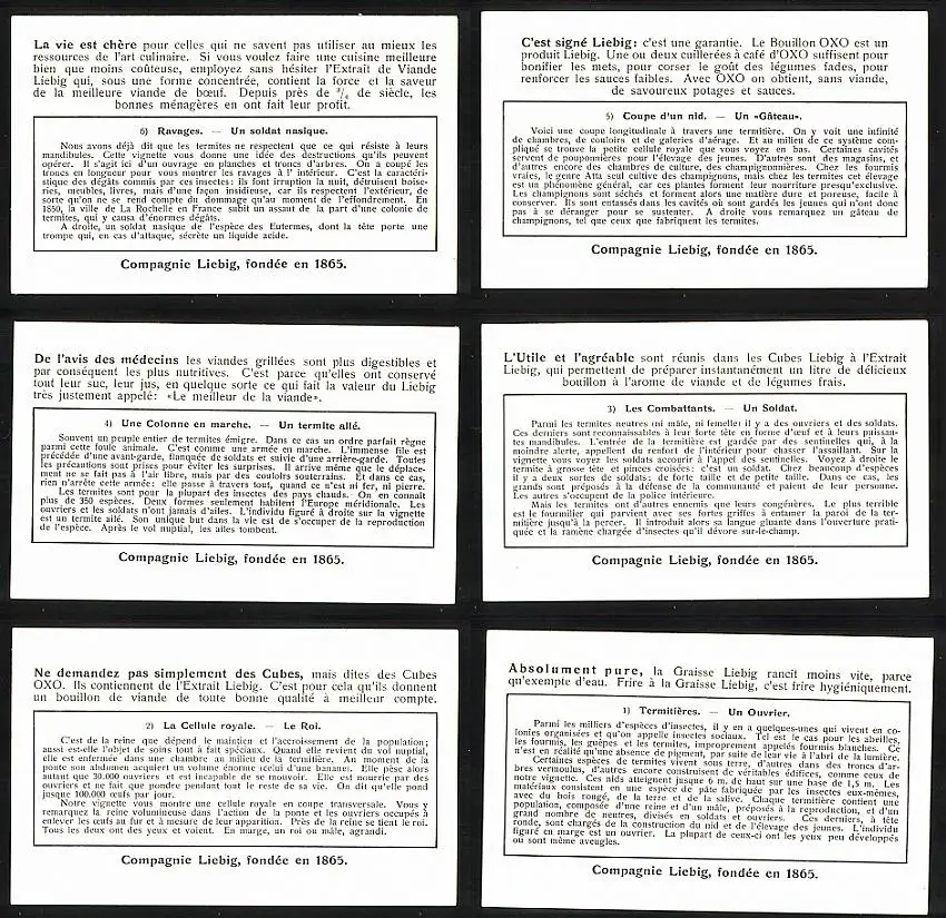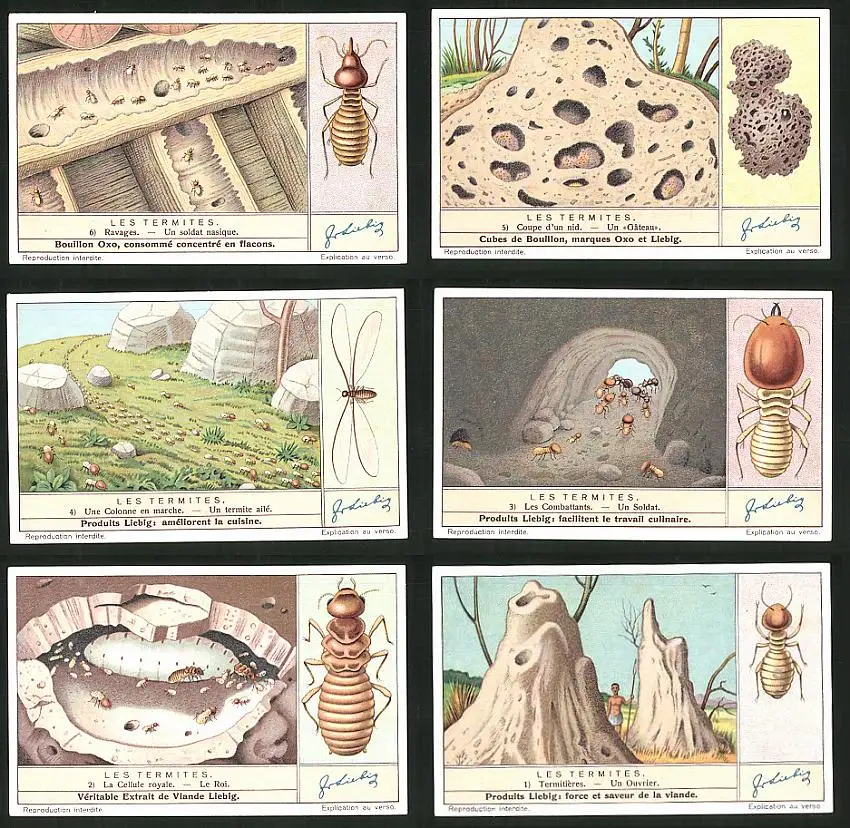6 Sammelbilder Liebig, Serie Nr. 1364: Les Termites, Termitiéres, Un Ouvrier, La Cellule royale, Le Roi, Un Soldat