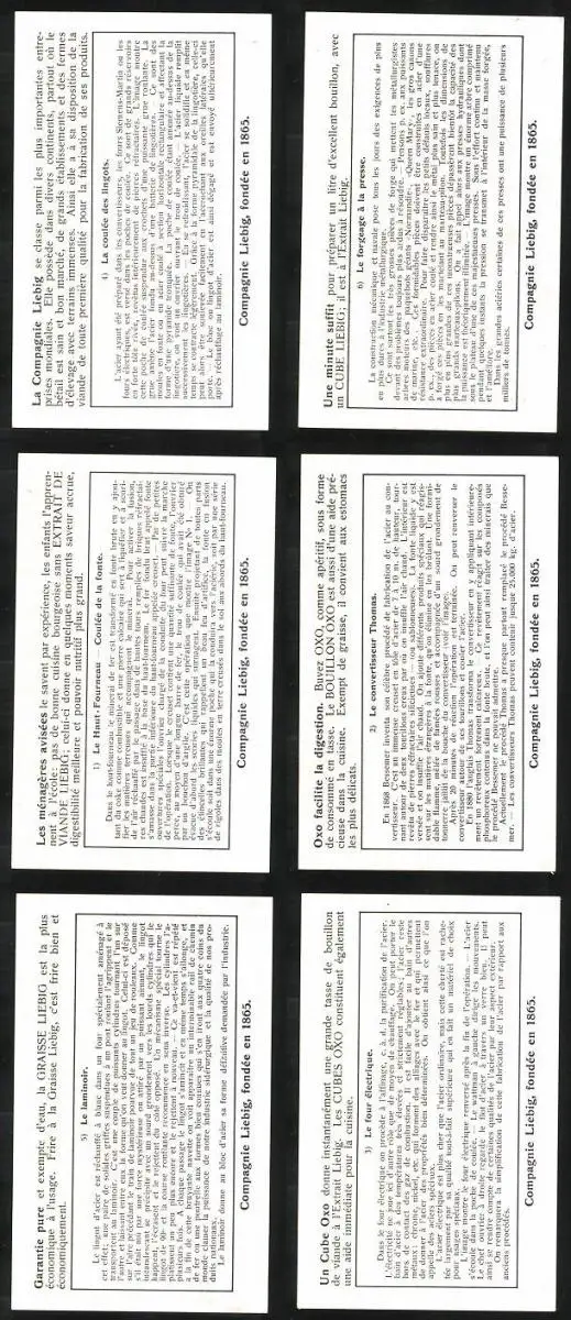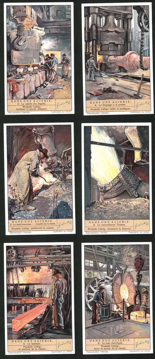 6 Sammelbilder Liebig, Serie Nr. 1369: Dans une Acierie, Le four Électrique, Le laminoir, Le convertisseur Thomas