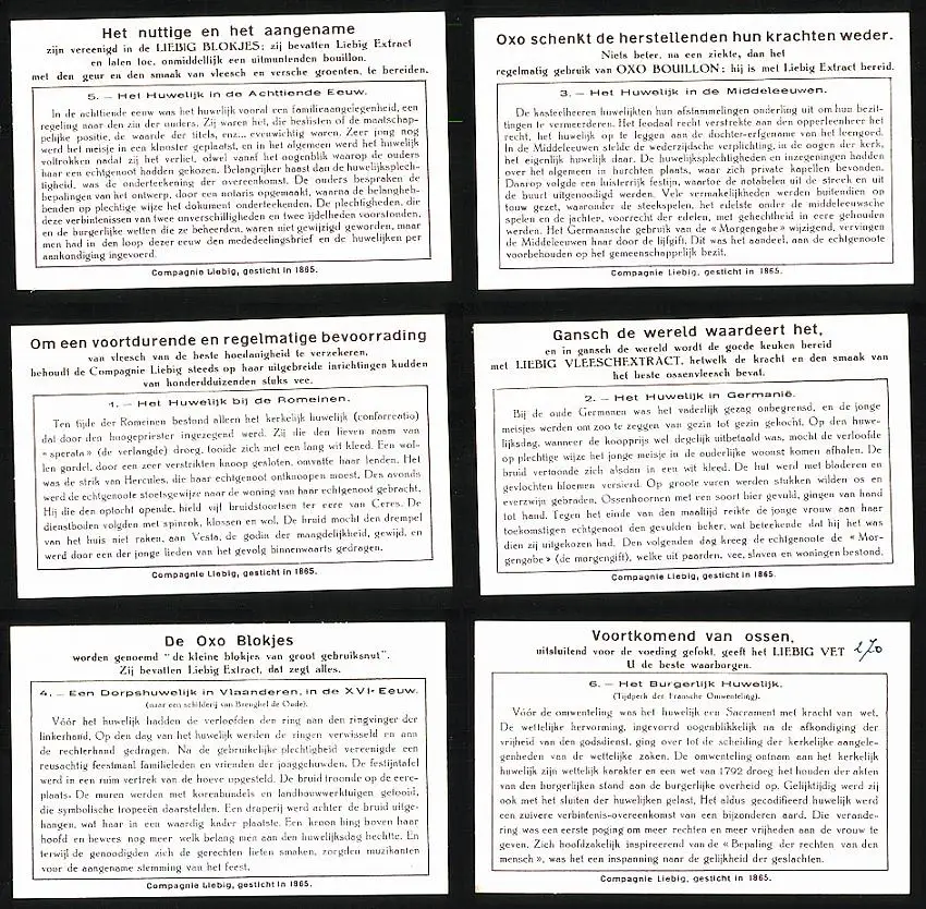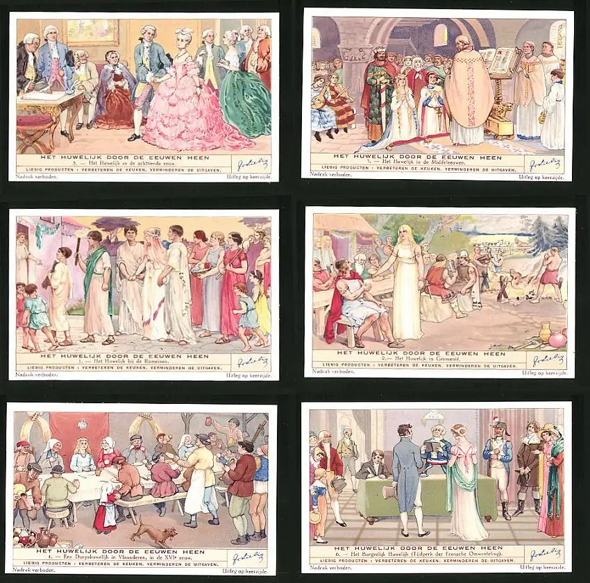 6 Sammelbilder Liebig, Serie Nr. 1384: Het Huwelijk door de eeuwen Heen, Het Burgerlijk Huwelijk, Festmahl