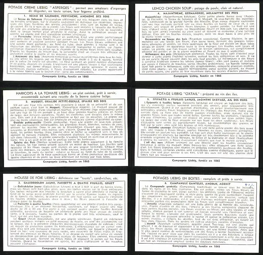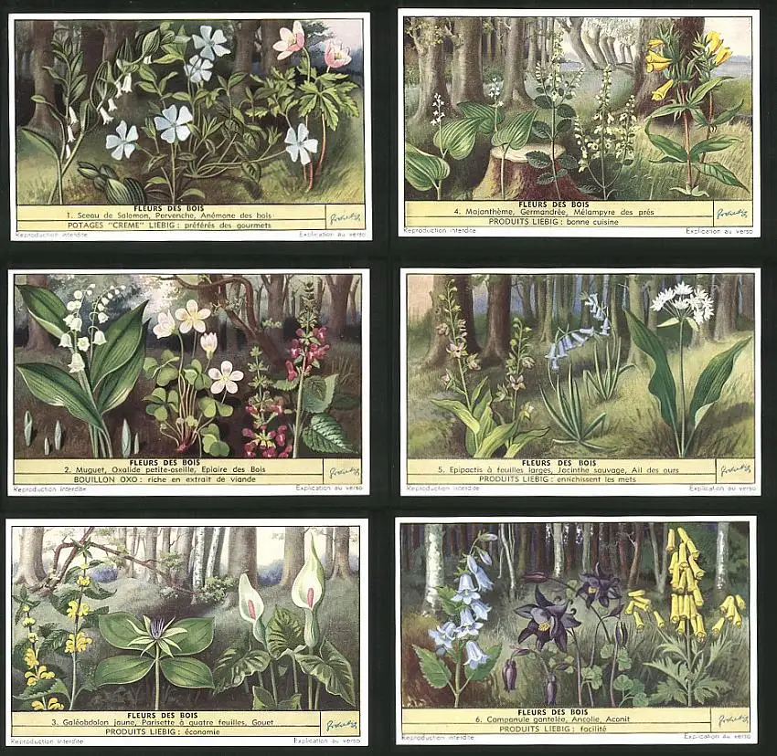 6 Sammelbilder Liebig, Serie Nr.: 1568, Fleurs des Bois, Ancolie, Gouet, Ail des ours, Epiaire, Majantheme, Anemone