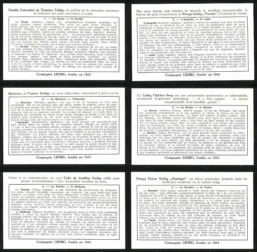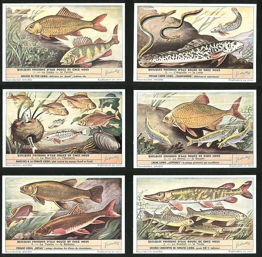 6 Sammelbilder Liebig, Serie Nr.: 1573, Quelques Poissons d`Eau douce de chez nous, Hecht, Brochet, Tanche, Breme