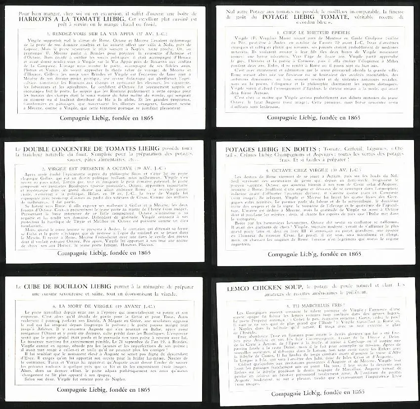 6 Sammelbilder Liebig, Serie Nr. 1581: Virgile, Chantre d`Auguste, Chez le rhéteur Epidius, Tu Marcellus eris
