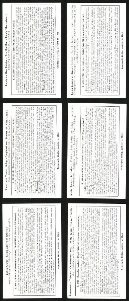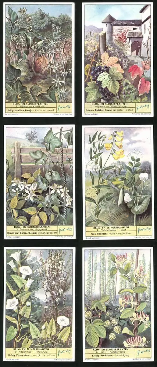 6 Sammelbilder Liebig, Serie Nr. 1624: Klim-En Slingerplanten, Hop, Kamperfoelie, Haagwindle, Warkruid, Erwt