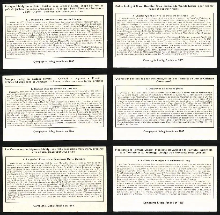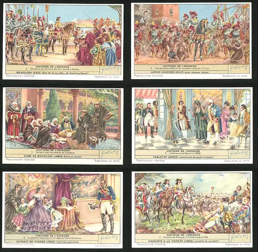 6 Sammelbilder Liebig, Serie Nr. 1653: Histoire de L`Espagne, Philippe, Marie-Christine, Tunis, Naples