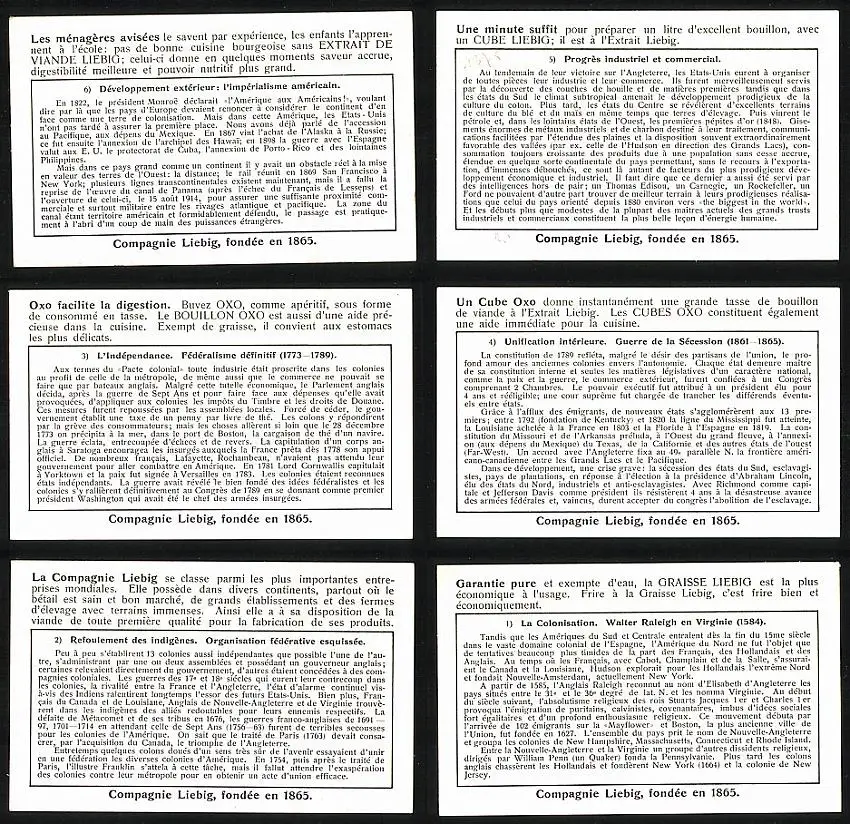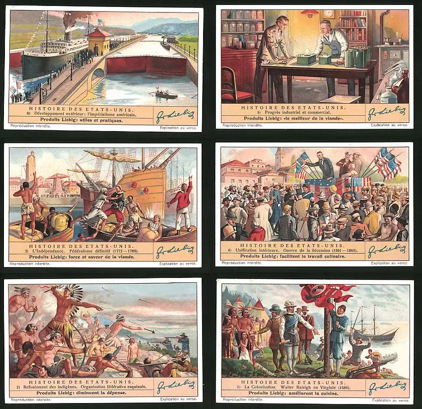 6 Sammelbilder Liebig, Serie Nr. 1659: Histoire des Etats-Unis, La Colonisation, Refoulement des indigénes