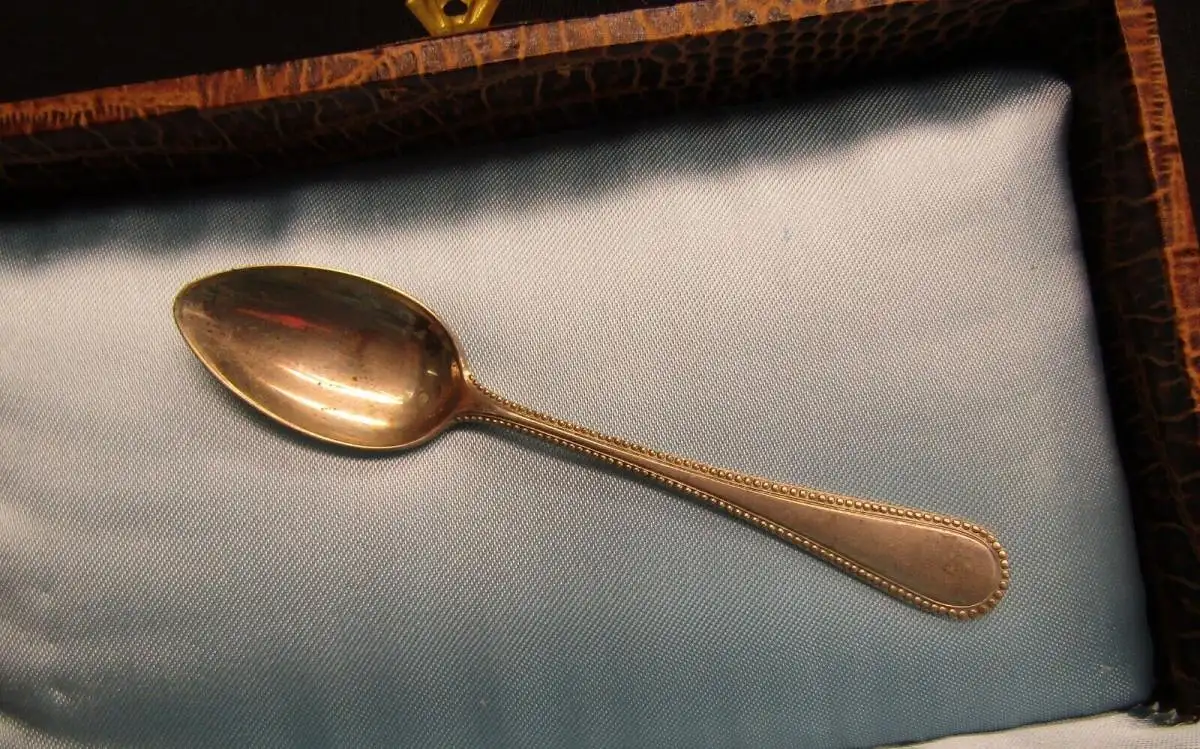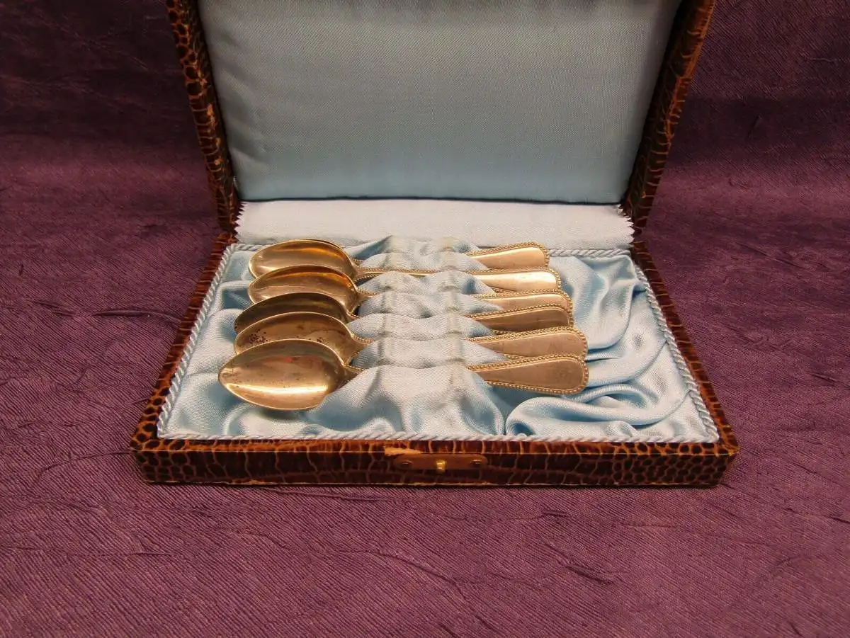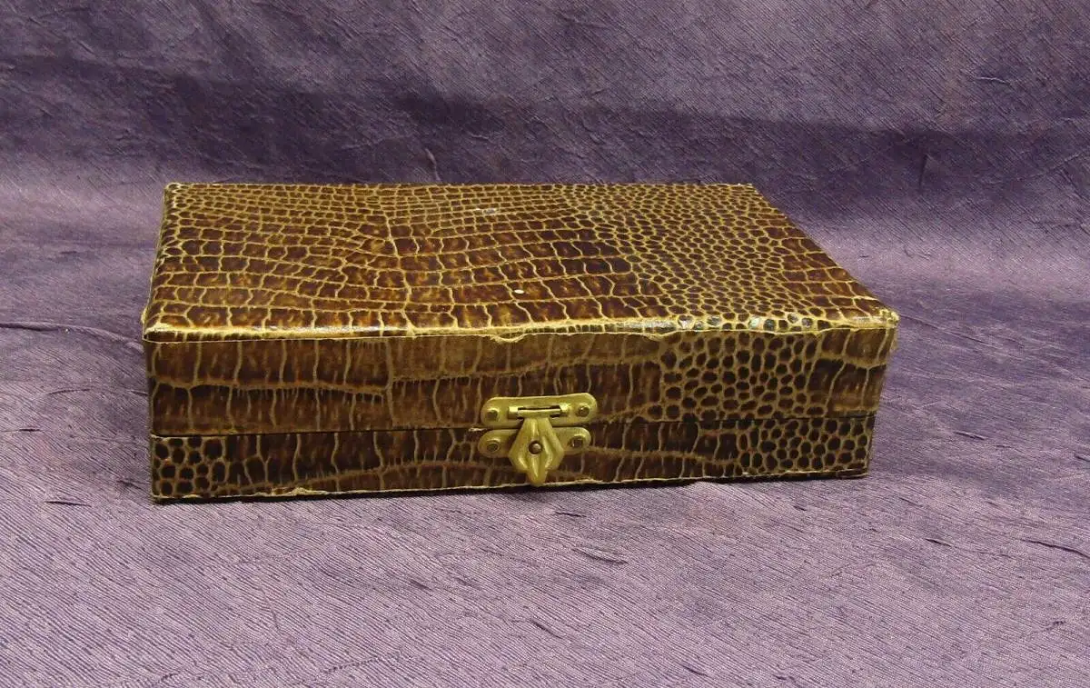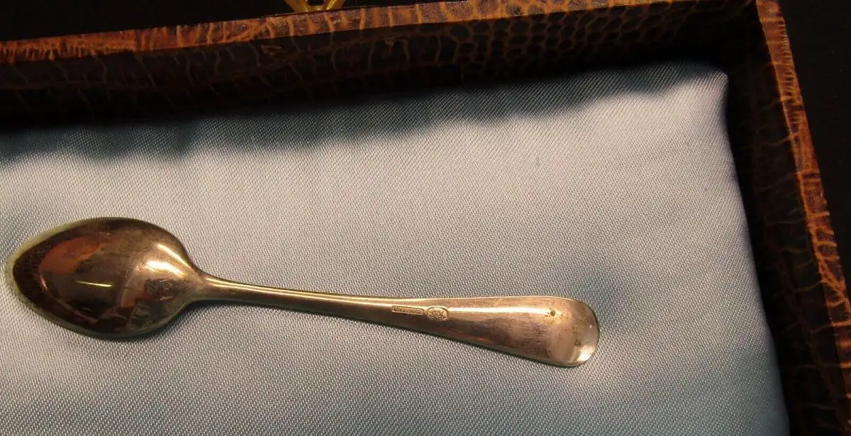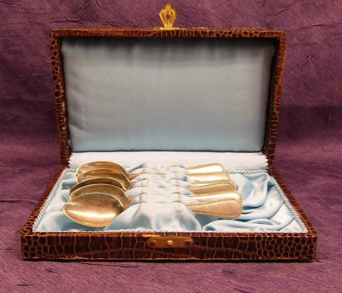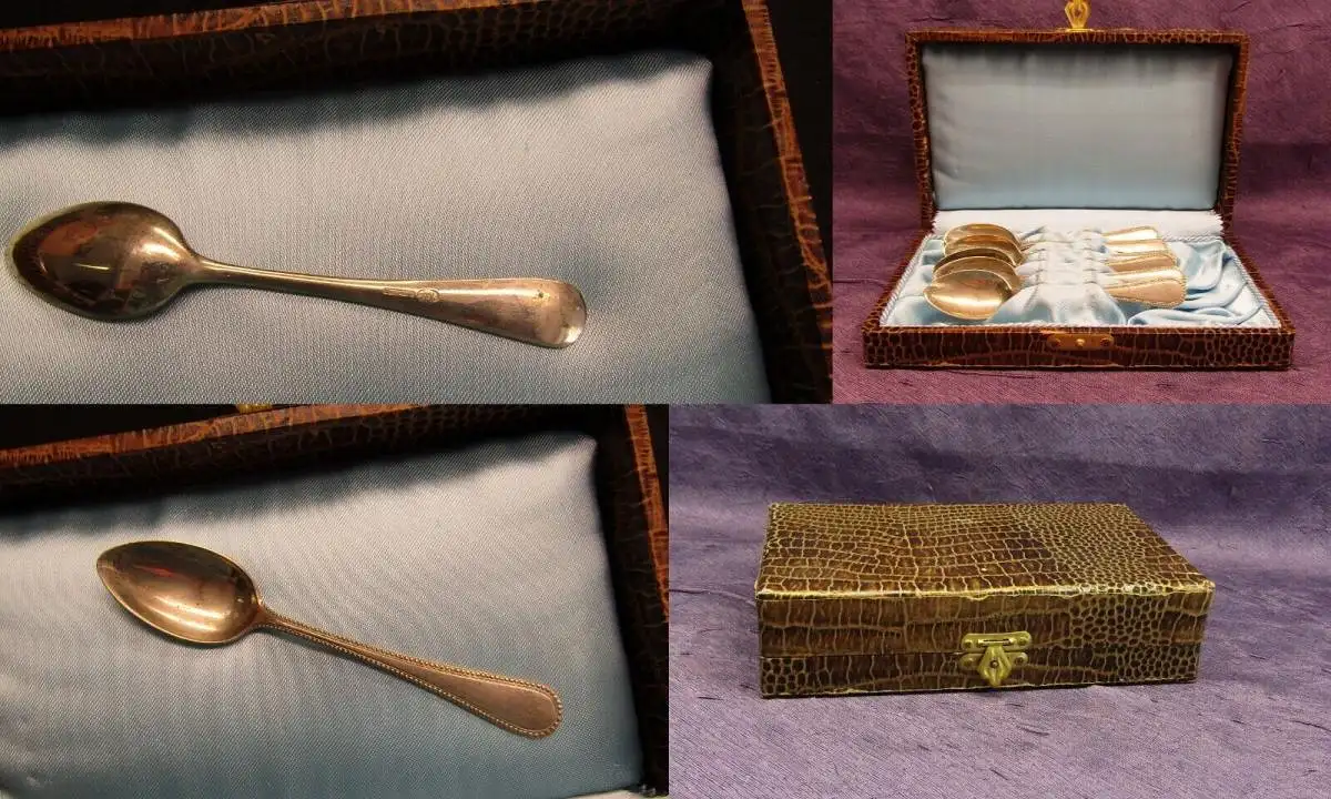 Schachtel etwas mehr berieben und bestoßen, Löffel patiniert und mit kleinen Gebrauchsspuren. Gutes Exemplar. Bilder sind Bestandteil der Zustandsbeschreibung. Zustand wurde bereits im Preis berücksichtigt.