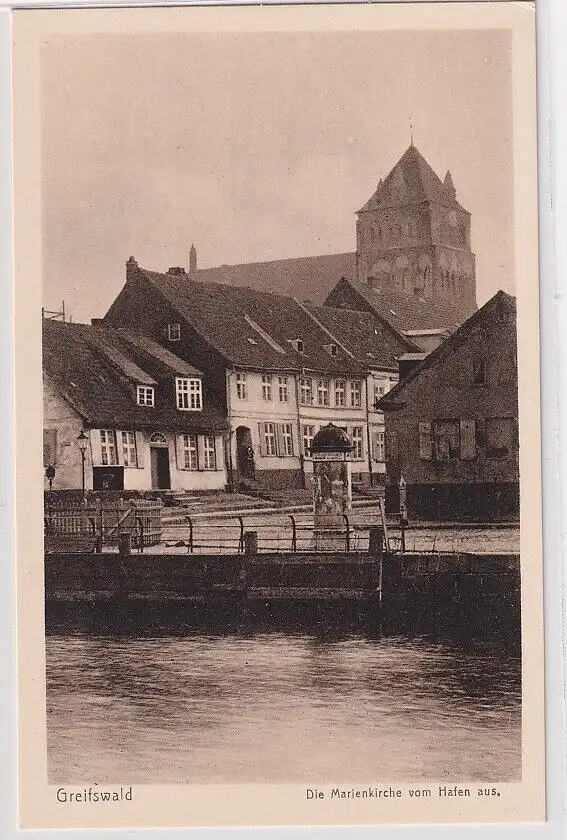 69201 Ak Greifswald Marienkirche vom Hafen aus um 1930