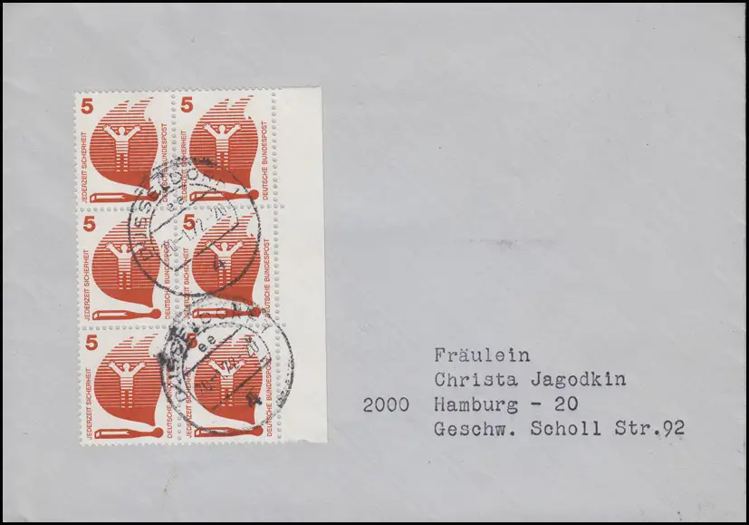694 Unfall 5 Pf als Rand-6er-Block MeF auf Brief DÜSSELDORF 20.1.72 nach Hamburg