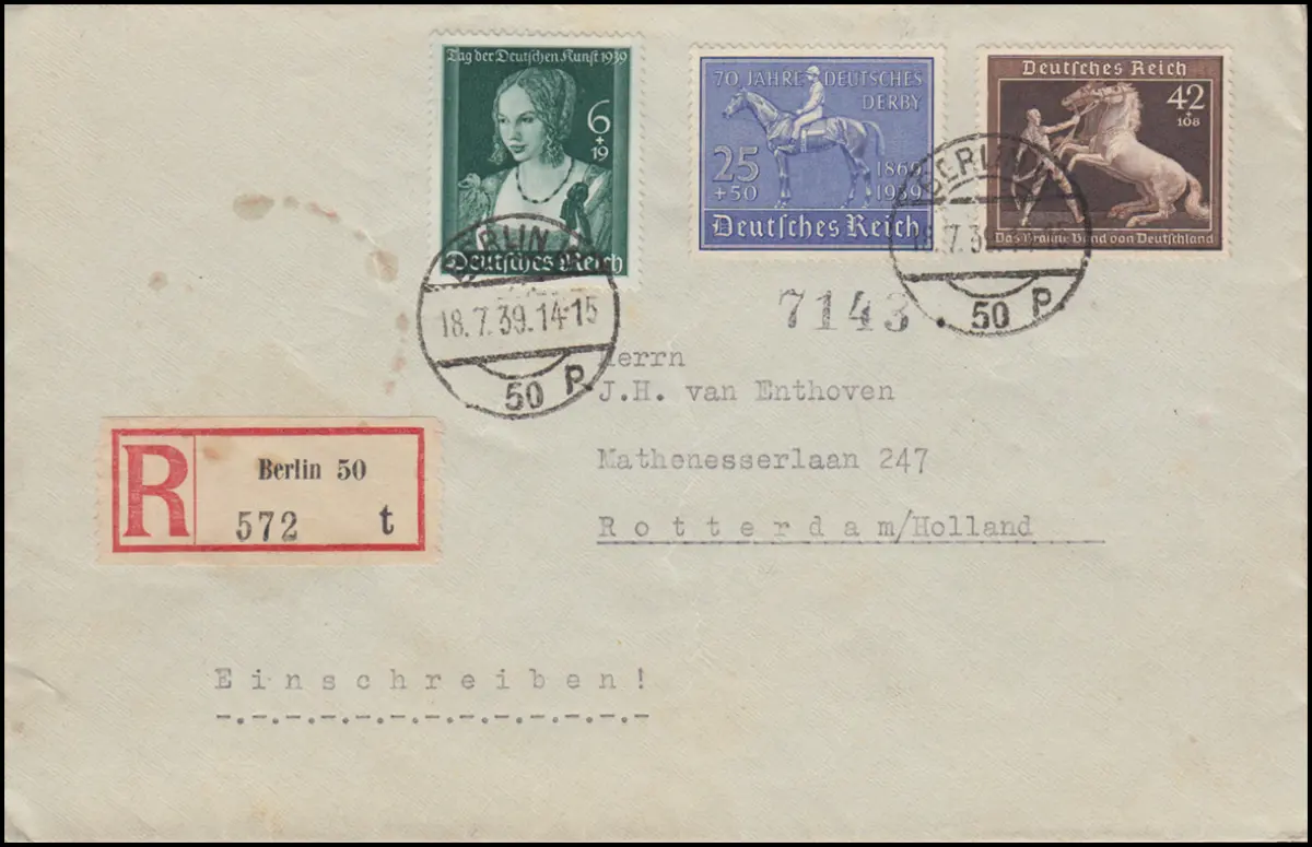 698 Derby + 699 Das Braune Band + 700 Kunst auf R-Brief BERLIN W 50 - 18.7.1939