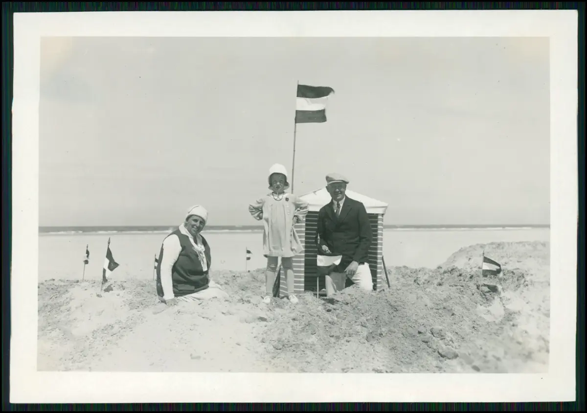Motiv: Familie am Strand, elegante Bademode der 1920er Jahre, Kind mit Flagge, Strandhütte im Hintergrund – stimmungsvolles Zeitdokument der frühen Freizeit- und Bäderkultur.