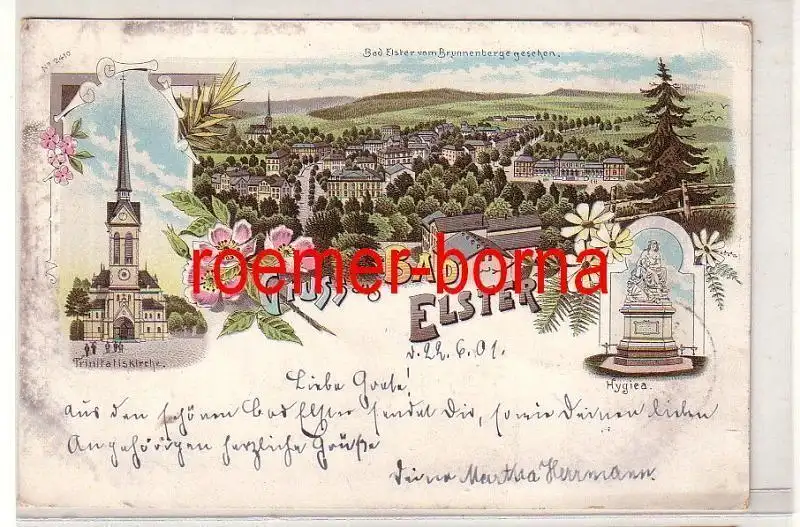 schöne farbige Lithographie, Bad Elster vom Brunnenberge gesehen, Trinitatiskirche, Hygiea, gelaufen, gute Erhaltung siehe Bild,