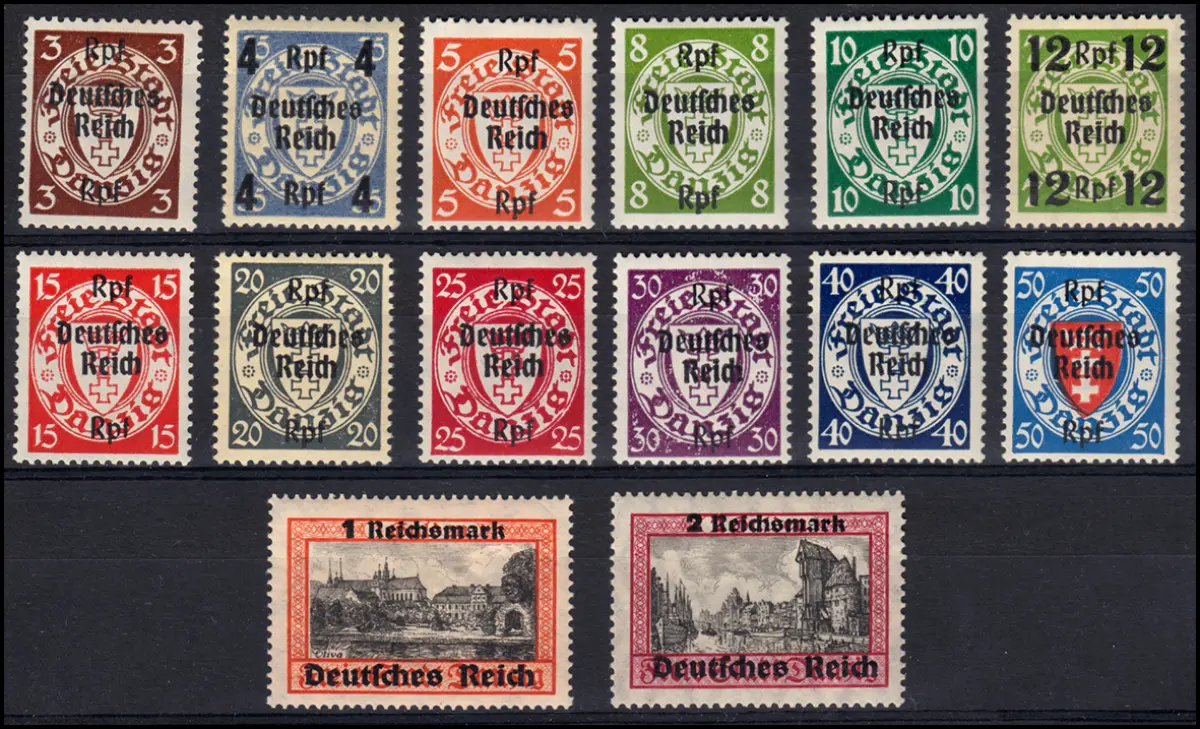 716-729 Danzig-Aufdruck 1939, 14 Werte kompl., Satz mit Falzresten / entfalzt *