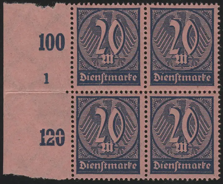 72 Dienstmarke 20 M. Rand-Viererblock mit der Formnummer 1, gefaltet **