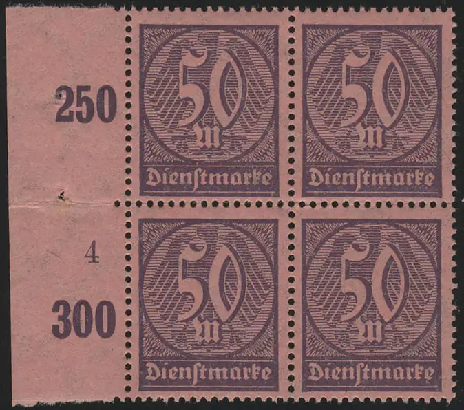 73 Dienstmarke 50 M. Rand-Viererblock Formnummer 4, wie oft üblich gefaltet **