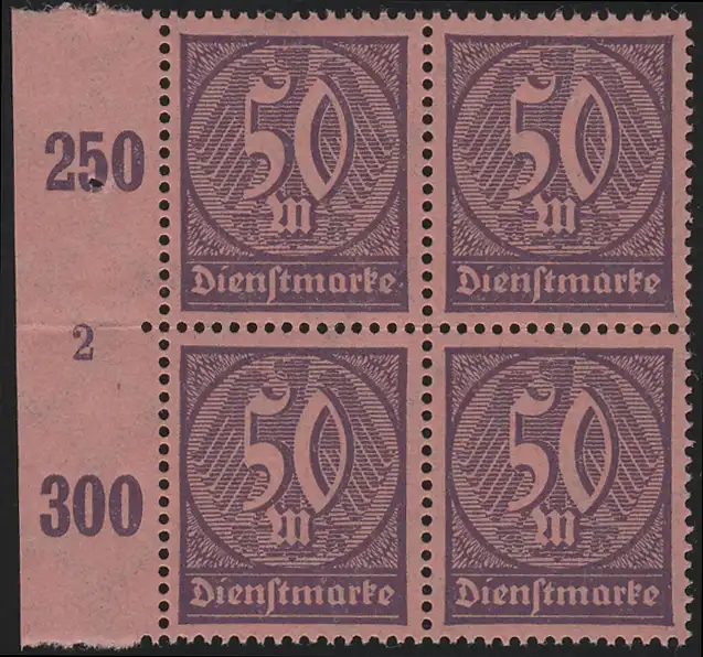 73 Dienstmarke 50 M. Rand-Viererblock mit Formnummer 2, gefaltet, **