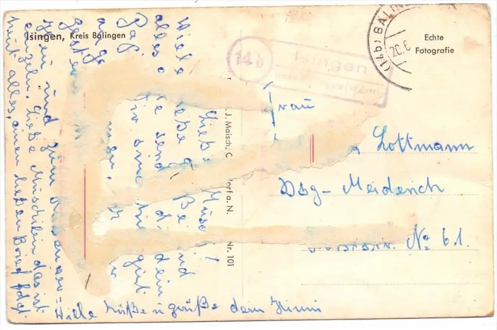 7463 ROSENFELD - ISINGEN, Dorfansicht, Landpoststempel, rücks. Klebereste
