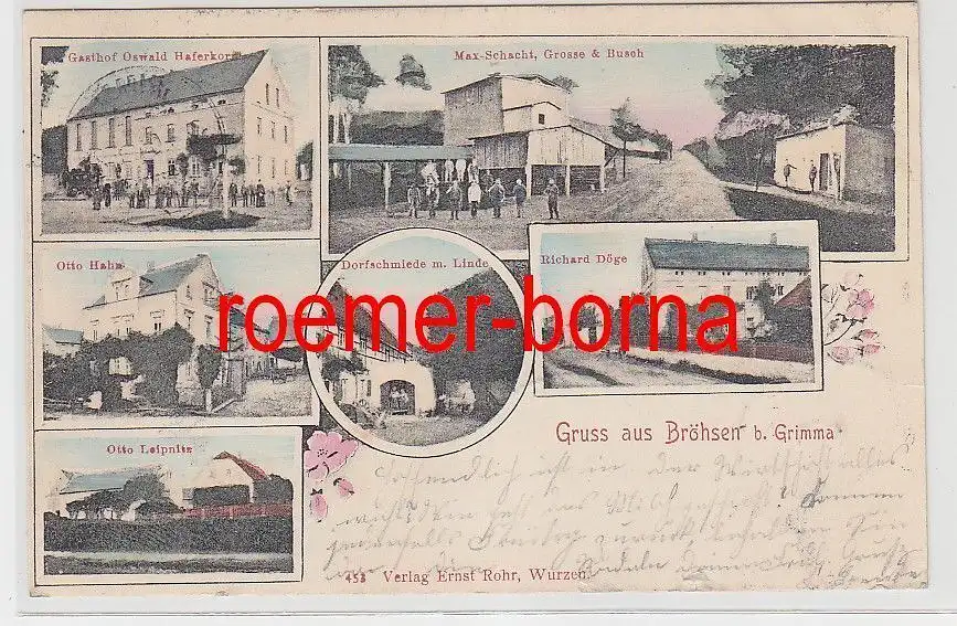 Gasthof Oswald Haferkorn, Max-Schacht Grosse & Busch, Otto Hahn, Dorfschmiede m. Linde, Richard Döge, Otto Leipnitz gelaufen guter Zustand, leichte Randläsuren an der unteren Kante, siehe Bild