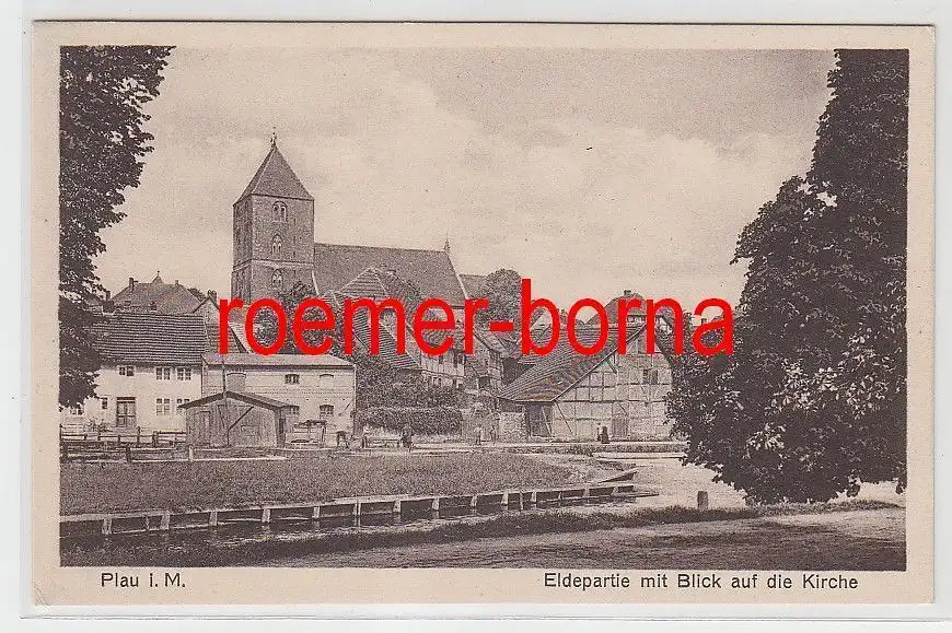 75837 Ak Plau in Mecklenburg Eldepartie mit Blick auf die Kirche um 1930